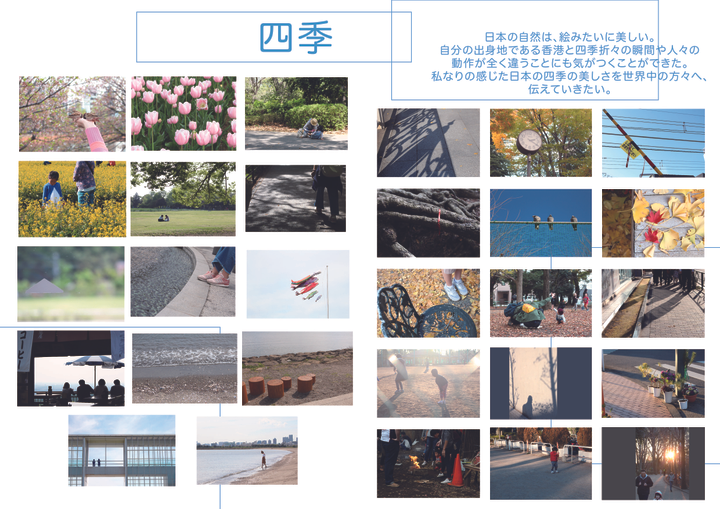 日本の四季の組写真を撮ってみました。 日本の自然は、絵みたいに美しい。自分の出身地である香港と四季折々の瞬間や人々の 動作が全く違うことにも気がつくことができた。私なりの感じた日本の四季の美しさを世界中の方々へ、伝えていきたい。