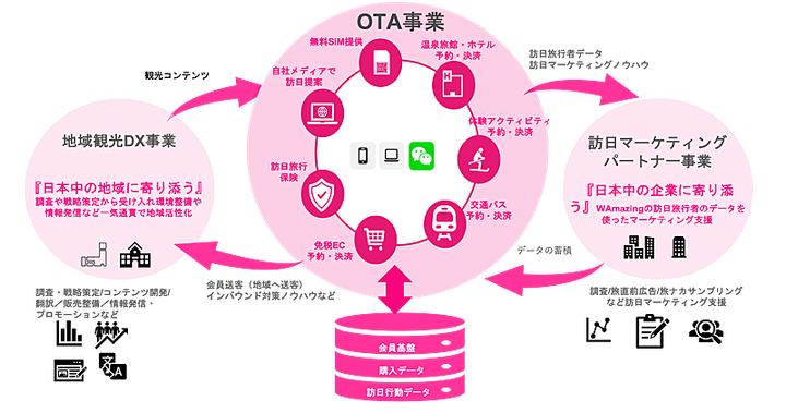 主に中華圏(台湾・香港・中国)のリピーターを対象に、旅マエからリーチ可能なワンストップ訪日旅行プラットフォーム(経済圏)を構築。旅行予約は訪日客向けにデジタル化(EC化)が遅れているスキー場や温泉宿など地方コンテンツに強く、買物は免税販売をDX化した日本初のビジネスモデルを強みに渉外業務を担当。