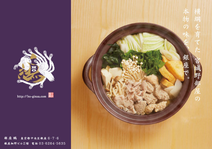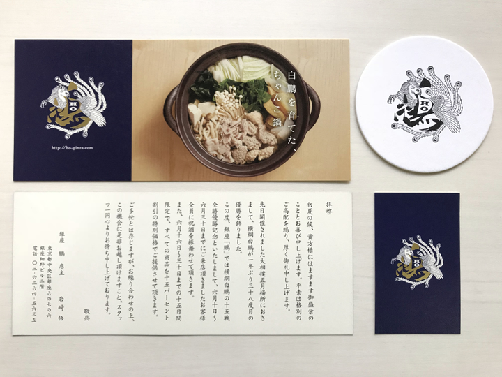 ちゃんこ店 鵬(白鵬関連のお店です)のショップツール・DMのデザインの一部を担当しました。 場所が銀座ということもあり、会員制のちゃんこのお店です。 ブランディングから携わっています。 シンプルですが、重厚感のある色使い・デザインになっています。