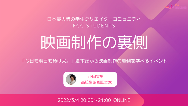 今後は自分の運営している学生クリエイターコミュニティである「FCC STUDENTS」の拡大をしていきたいと思います。 学生クリエイター向けスクール事業、案件のマッチング事業、クリエイティブ企業のインターン先のマッチング事業、学生クリエイターマーケティング事業など幅広く事業を展開してい