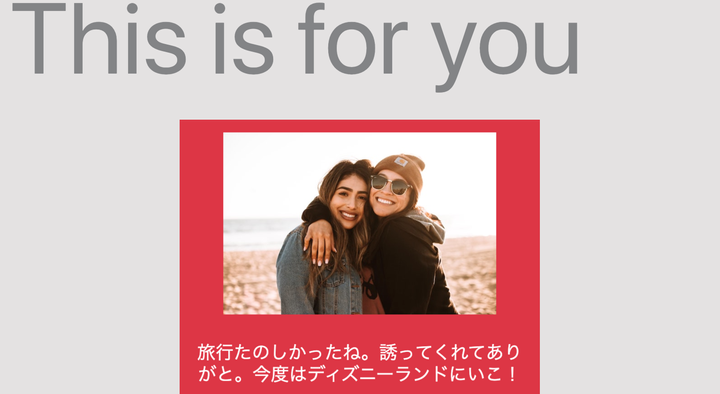 初めて作ったアプリです。手軽にポストカードが作れます。 友達に一緒に写った写真入りのポストカードをもらいました。とても嬉しく、心に残るできごとだったためこのアプリを作りました。 画像とメッセージの組み合わせ次第でおもしろ画像も作れます。 いろいろな使い方でお楽しみください。 今後レスポンシブも整えていく予定です。