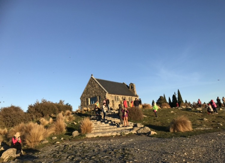 1935年に建てられた石造りの教会で、その牧歌的な雰囲気と、テカポ湖の色合いや壮大な景色が見事にマッチしていて、絶好のフォトスポットになっています。また、教会の扉を開けると正面に十字架があり、その向こう側はガラス張りの窓になっていますので、教会の内部からも美しいテカポ湖が見渡せます。