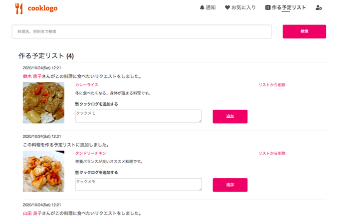 # アプリケーションの概要 作った料理を記録して共有できる、料理投稿SNSサービス。 # アプリケーションの機能 ・作った料理を投稿 ・画像を正方形に整形して投稿(CarrierWaveを使用) ・料理ログ登録(料理を作る度にログを追加し、これまでにいつ作ったか、何回作ったかが一目でわかる) ・別ユーザーの料理に対して「食べたい!」リクエストを送信 ・フォロー ・お気に入り登録 ・コメント ・通知(お気に入り登録 or コメントがあった場合) ・検索(Ransackを使用) ・CSV出力 ・ログイン ・ログイン状態の保持 ・モデルに対するバリデーション # 環境 ■フレームワーク Ruby on Rails ■データベース PostgreSQL ■インフラ AWS ■開発環境 Docker