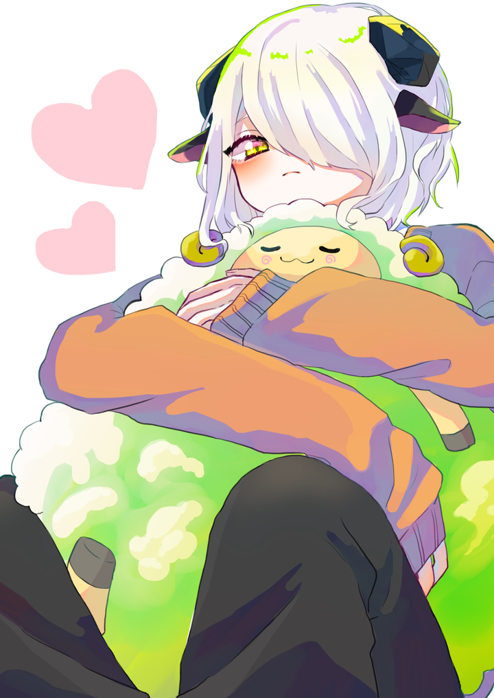 使用ソフト:Photoshop 作業時間:約3時間半 誰が見ても「可愛い」「愛したい」と思って貰えるような絵になるように心掛けました。 顔に力を入れているのでら羊のぬいぐるみの顔もキャラクターの顔の近くに持って行き、視線が集まるように工夫しました。 キャラクターの色が落ち着いた色なので、羊のぬいぐるみの影の色をはっきりとした色にして、インパクトを加えました。 触れたくなるような絵を目指したかった為、立体感を意識し、陰影をはっきりと描いています。