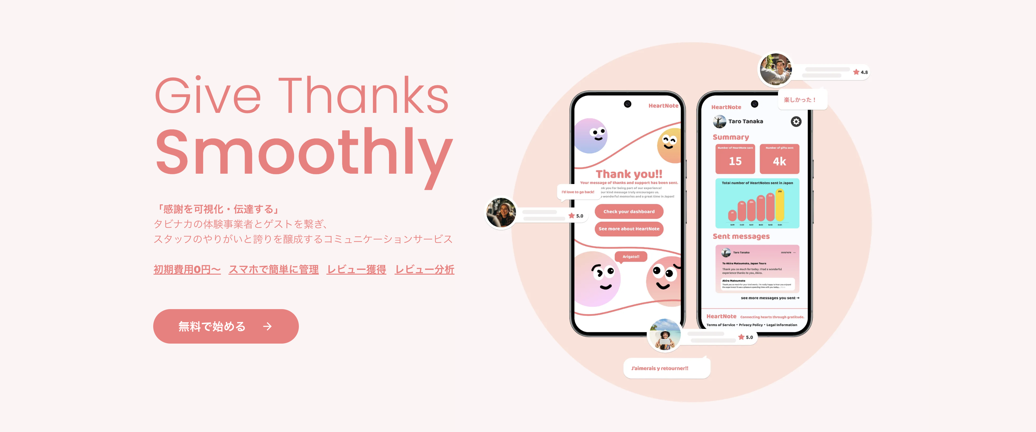 HeartNote(ハートノート)は、旅先で生まれる「ありがとう」を、なめらかに届けるメッセージアプリ。 HeartNoteでは、メッセージとデジタルチップ(オンライン投げ銭)という形で、スタッフやガイドに直接届けられるアプリです。 体験後にゲストにカードを渡すだけで、メッセージやチップの収集、寄付の受け付け、高評価レビューの獲得を行うことができます。外国人