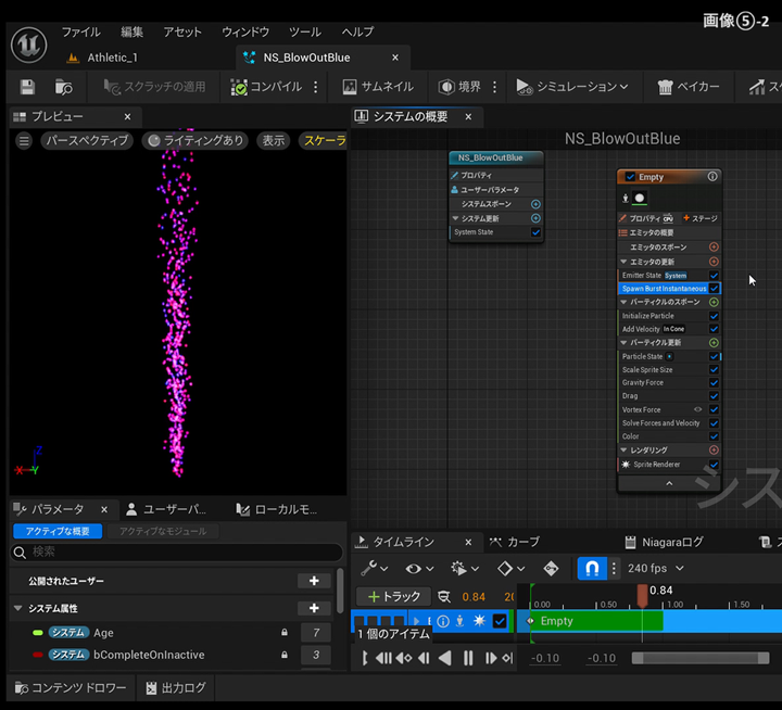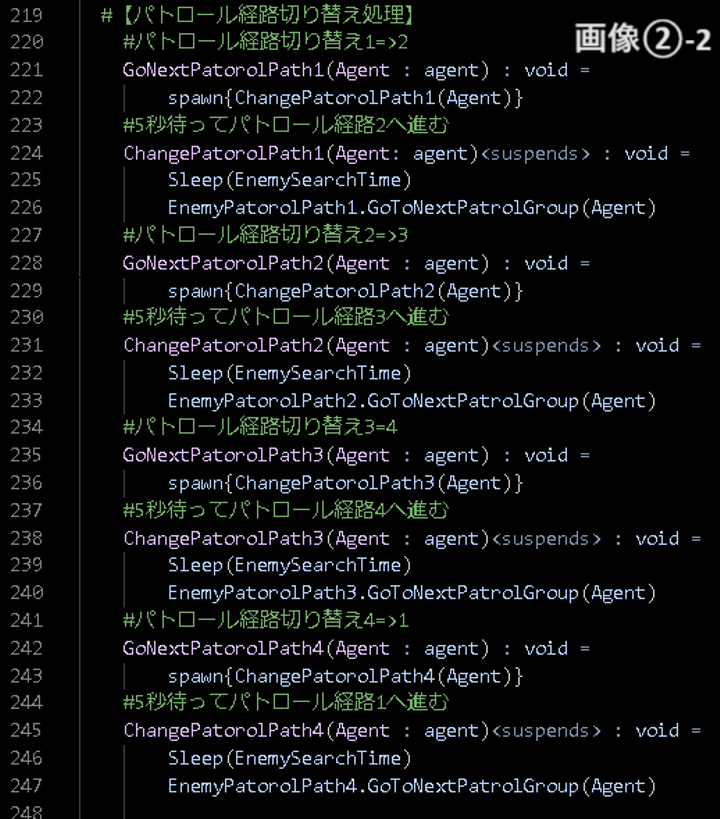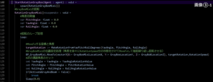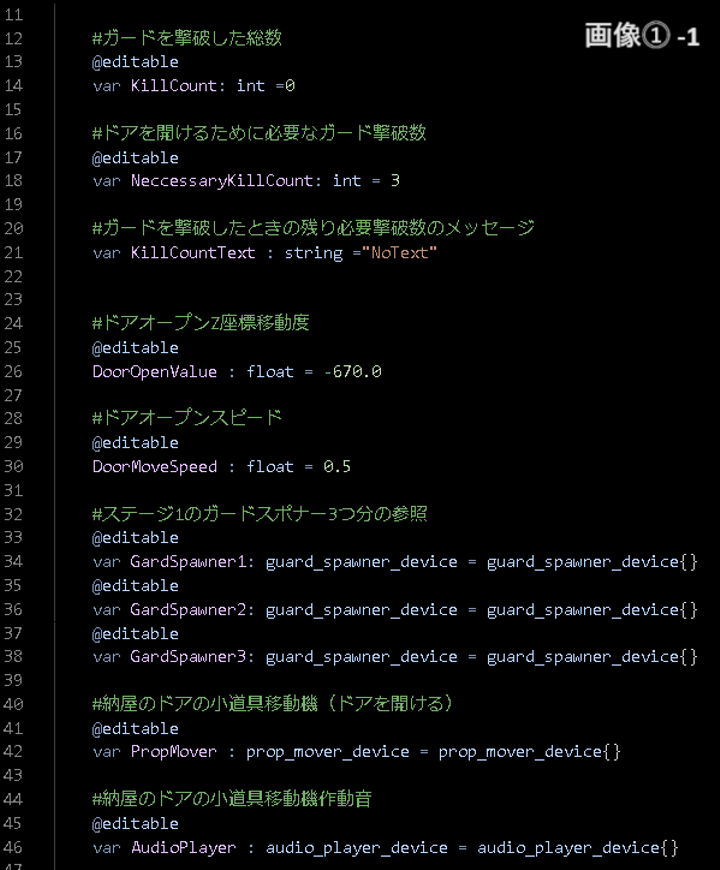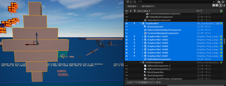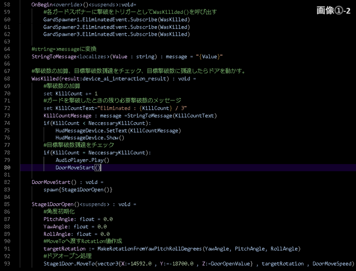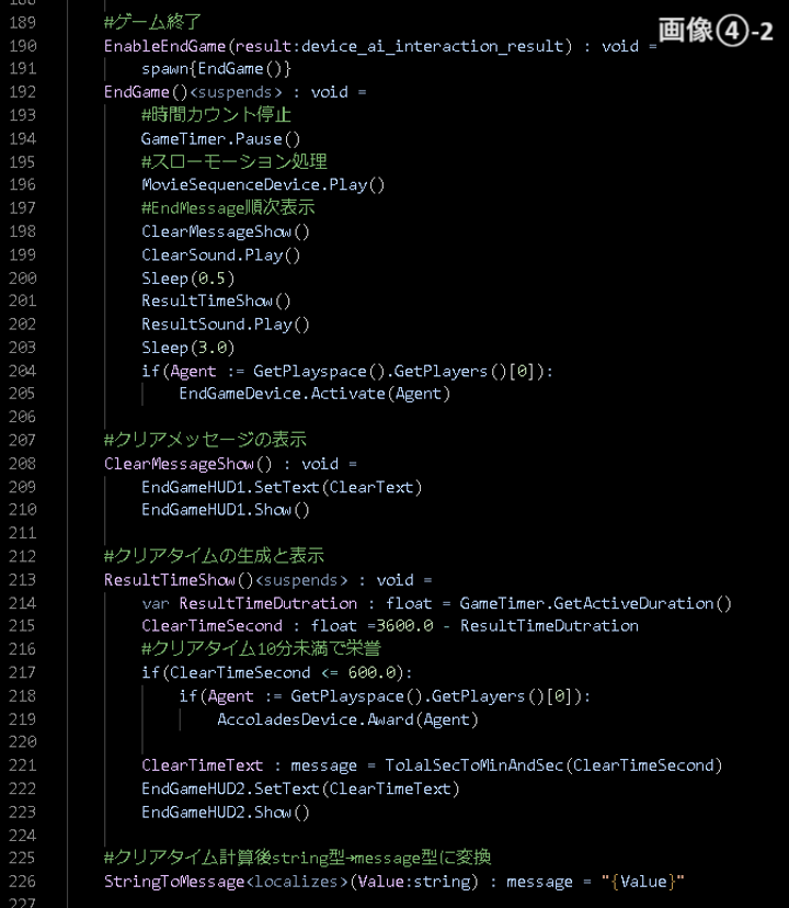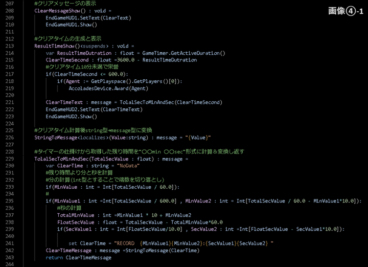 私がUEFNで制作したフォートナイトの島が先日EpicGamesの審査を通過し、公開されましたので島の概要と技術レビューを書かせていただきます。 技術レビュー内の各実装が実際にどのように動いているかを確認するための動画も是非視聴ください! なお動画内でプレイヤーが飛行しておりますがこれは各実装を見やすくするために一時的に飛行機能をONにしているものであり、実際のゲームでは飛行はできません。 タイトル: COMBAT ATHLETIC 島コード:9674-4819-1884 ※このコードをフォートナイト内で検索していただくと実際に遊ぶことができます。 概要: タイムアタック形式のアスレチックゲームです。プレイヤーはコース内に配置された敵や障害物を乗り越え、最速タイムでのゴールを目指します。 技術レビュー: 今回のゲーム上でversとNiagaraの一部を紹介します。 ①設定された数の敵を撃破することでドアが開く仕掛け (画像⓵-1、⓵-2) 最初のエリアでは次のエリアに進むための経路上にシャッターがあり、エリア内の敵を全滅させることでシャッターが開く仕組みをvarseで実装しています。合計撃破数KillCountと目標撃破数NeccessaryKillCountの二つの変数を設定し、敵が撃破されるまいにKillCountがNeccessaryKillCountに到達したかどうかをチェックし、条件達成時にシャッターのオブジェクトが移動してサウンドが再生するように実装しました。 ②見張り台上の敵キャラのパトロール行動制御(画像②-1、②-2、②-3) 見張り台にいる敵が1方向を監視してしばらくたったら別の方向を向いて…と繰り返して4方向を順番に警戒する動作をverseで実装しました。敵がパトロールで移動する経路を指定する「パトロール経路の仕掛け」というUEFNにあらかじめ用意されている機能を活用してvarseでコントロールすることで実現しています。 仕組みとしては「パトロール経路の仕掛け」を利用して4つのパトロールコースを見張り台上に用意しそれぞれのコースはそれぞれの方向を向くように配置し、1つのコースが終了したら一定時間(コード上ではEnemySearchTimeという変数に設定)静止し、次のコースに入るというようにしています。 ③回転する足場の仕掛け 足場が縦方向にくるくる回転し続けるようにverseで実装し、飛び移るタイミングを考えないと落ちてしまう仕掛けにしました。 足場は7個のキューブをつなげて、空のブループリントを作成してこれを親として7個のキューブを子にすることでグループ化しています。親となっているブループリントに対してverseでloop文を用いて回転し続けるように実装しています。 ④ボス撃破時のクリア演出とクリアタイムの計算と表示(画像④-1、④-2) ゲームはクリアした後に終了されなければなりません。このゲームは最後に登場するボスを撃破すればゲームクリアなので、ボスの撃破をトリガーにゲームクリアの演出が開始されるようにverseを使って実装しました。またこのゲームはタイムアタック形式であるためクリアタイムと現在のタイムを表示する仕掛けを「タイマーの仕掛け」を使って実装しました。ゲームの終了自体は「ゲーム終了の仕掛け」がUEFNに用意されているのでそれをverseで制御しています。 演出の内容としてはゲームの動きをスローモーションにするレベルシーケンスを用意して、それがボスの撃破時に作動し、撃破の瞬間がスローモーションになる演出を作りました。そしてクリアタイム、クリアのメッセージがUIに表示されていくようにverseでクリア時の演出を実装しています。 クリアタイムは「タイマーの仕掛け」に備わっている残り時間(秒)を出力する関数を活用し、事前に制限時間を3600秒に設定し、ボスの撃破時点で残り時間(秒)を取得してそれを計算して例えば1分30秒を「01:30」といった表示形式になるようにverseで実装しています。C++言語には「1」を「01」と表示するように設定することができますがverseではそれができないため、このクリアタイムの計測の部分はとても工夫が必要でした。 さらにクリアタイムが10分未満だった場合に得られる経験値が増量になる「栄誉の仕掛け」が作動するようにverseで実装しています。 ⑤ボスキャラ登場時のVFX演出(Niagara)(画像⑤-1、⑤-2) Unreal Engineと同様にUEFNにもVFXを作るためのNiagaraを備えています。ボスキャラが上空から降ってきて地面に着地するときに花火が吹き上がるVFXを作成して実装しました。 今後も島制作をどんどんしていこうと思います。 最後まで記事を読んでいただきありがとうございます。