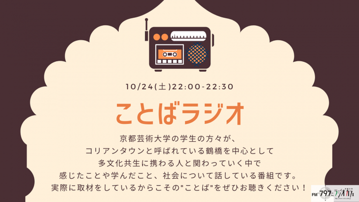 京都市崇仁地区、大阪府鶴橋など、様々な場所に訪れ取材執筆活動を行う中で、文章で伝えるだけでなく、学生の生の声を届けるために企画立案・制作を行いました。 収録時期は緊急事態宣言中でしたので、iPhoneアプリケーション「ボイスメモ」と「Zoom」を用いてリモートで収録を行い、その後データを回収しAdobe Auditionにて編集を行ったものを、NPO京都コミュニティ放送三条ラジオカフェ様にお渡しし、2020年10月24日に放送していただきました。