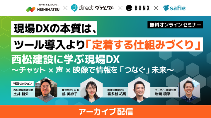 ■セミナー内容 建設・インフラの現場でDX化に向けた取り組みがされるようになってきた一方、扱う情報が多様化したことで、「どの場面で何を使うべきか」「どう現場に定着させるか」が重要なテーマとなっています。 こうした中で西松建設株式会社様では、チャット(direct)・声(BONX)・映像(Safie)という3つの情報手段を使い分け、現場で継続的に運用できる仕組みを構築してきました。 本セミナーでは、西松建設のDX推進を担う土井様に、取り組みの背景や定着に向けた工夫など、具体的な事例をお話しいただきます。さらに、現場で活躍する3サービスを提供する各企業も登壇し、対話形式で“現場のリアル”を深掘りします!