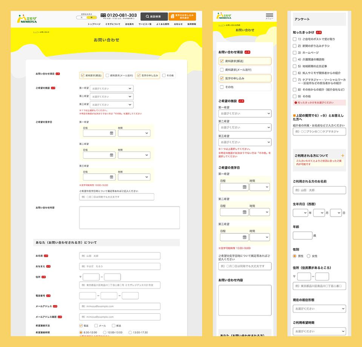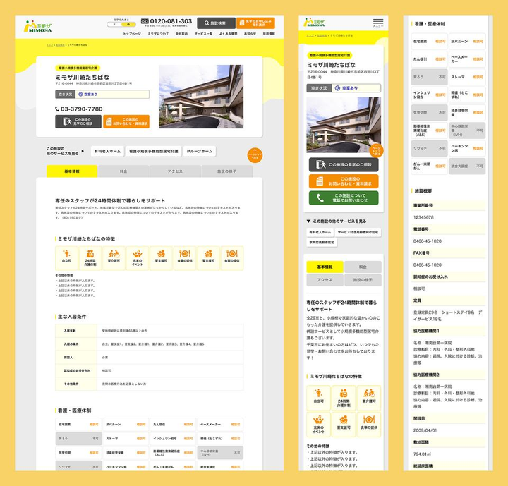 介護サービスを提供する会社のサービス兼コーポレートサイト大規模リニューアルのデザインを担当しました。 「介護業界の暗い現実が払拭されるようなイメージにしたい」「ビビッドな黄色やグリーンを用いたい」「写真よりイラストをメインで使いたい」という先方の希望を汲み取りながら、35P以上のページを作成しました。 進行途中でディレクターが何回も交代する事態が起こり、デザインだけではなく、先方との折衝も一部担いました。 また、イラストとピクトグラムは外注したため、その指示出しやクオリティコントロール、連絡等も担っています。