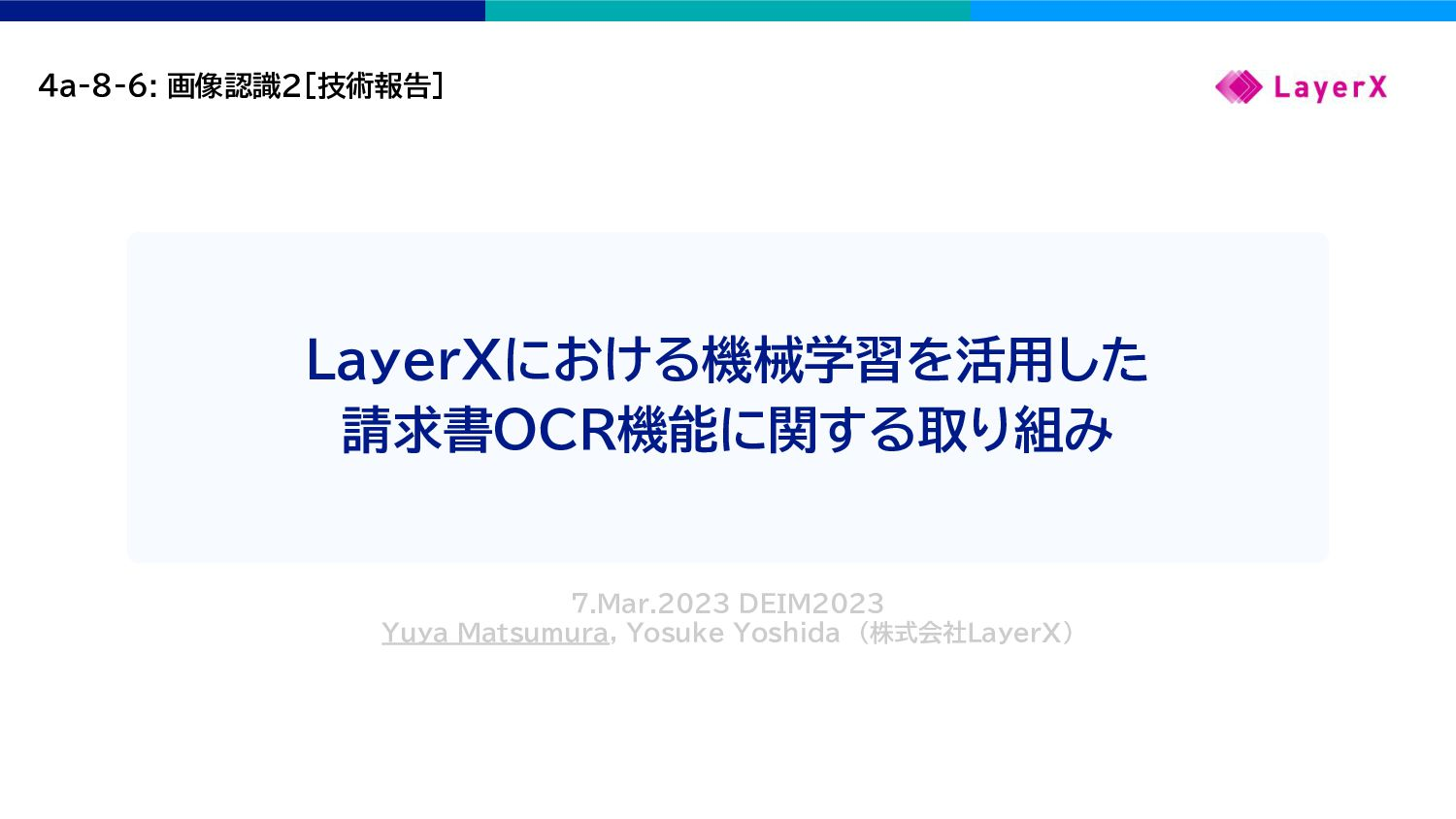 2023年3月7日 DEIM2023 (https://event.dbsj.org/deim2023/) における技術報告の資料です。 題目:『 LayerXにおける機械学習を活用した請求書OCR機能に関する取り組み』 日程:3/7(火)13:30-15:40(4a-8: 画像認識2) 発表者:松村 優也、吉田 陽祐 プログラムリンク:https://deim-management-system.github.io/deim2023_program/index.html#4a-8 LayerX は「働く」に関わる様々な業務プロセスが紙とハンコを中心としたアナログで非効率なものとなっているという課題を、テクノロジーをもとに解決するために複数のプロダクトを開発・運営している。その中のひとつ「バクラク請求書」では、アップロードされた請求書ファイルから自動で必要な情報を抽出しデータ化するOCR機能を提供している。このOCR機能の実現には、画像処理や自然言語処理などの機械学習技術を活用している。本発表では、OCR機能の開発に際してどのように機械学習技術の活用を行なっているのか、どのような技術的課題が存在するのかを紹介する。