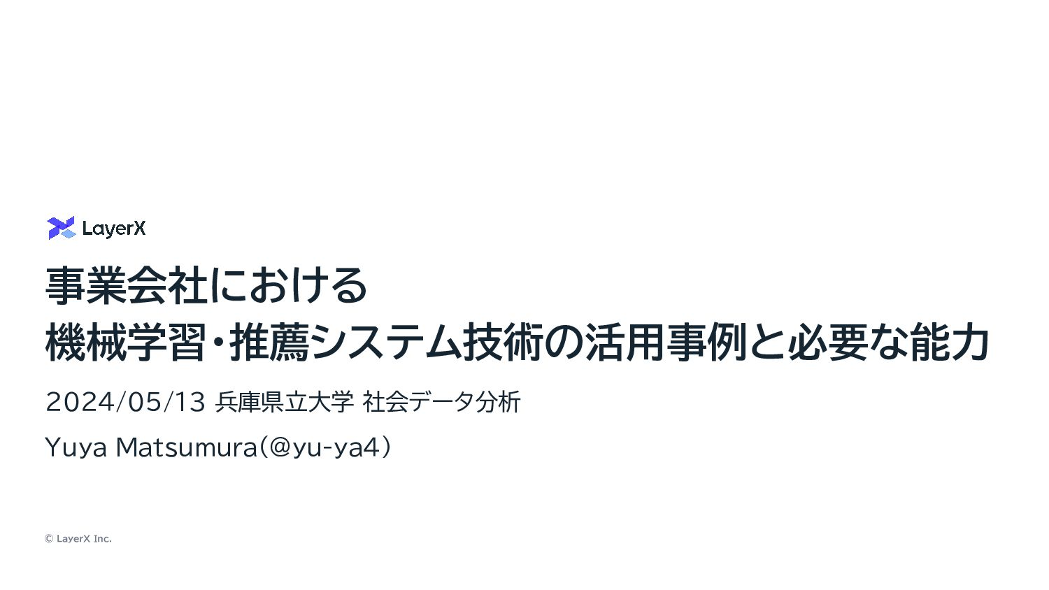 2024年05月14日 の兵庫県立大学の社会データ分析という講義における講演資料です。 機械学習や推薦システムという技術が事業会社におけるプロダクト開発でどのように活用されているのか、それを実現するデータサイエンティストや機械学習エンジニアというのはどういう職種なのか、LayerXのバクラク請求書やウォンテッドリーのWantedly Visit の例を使って紹介しました。