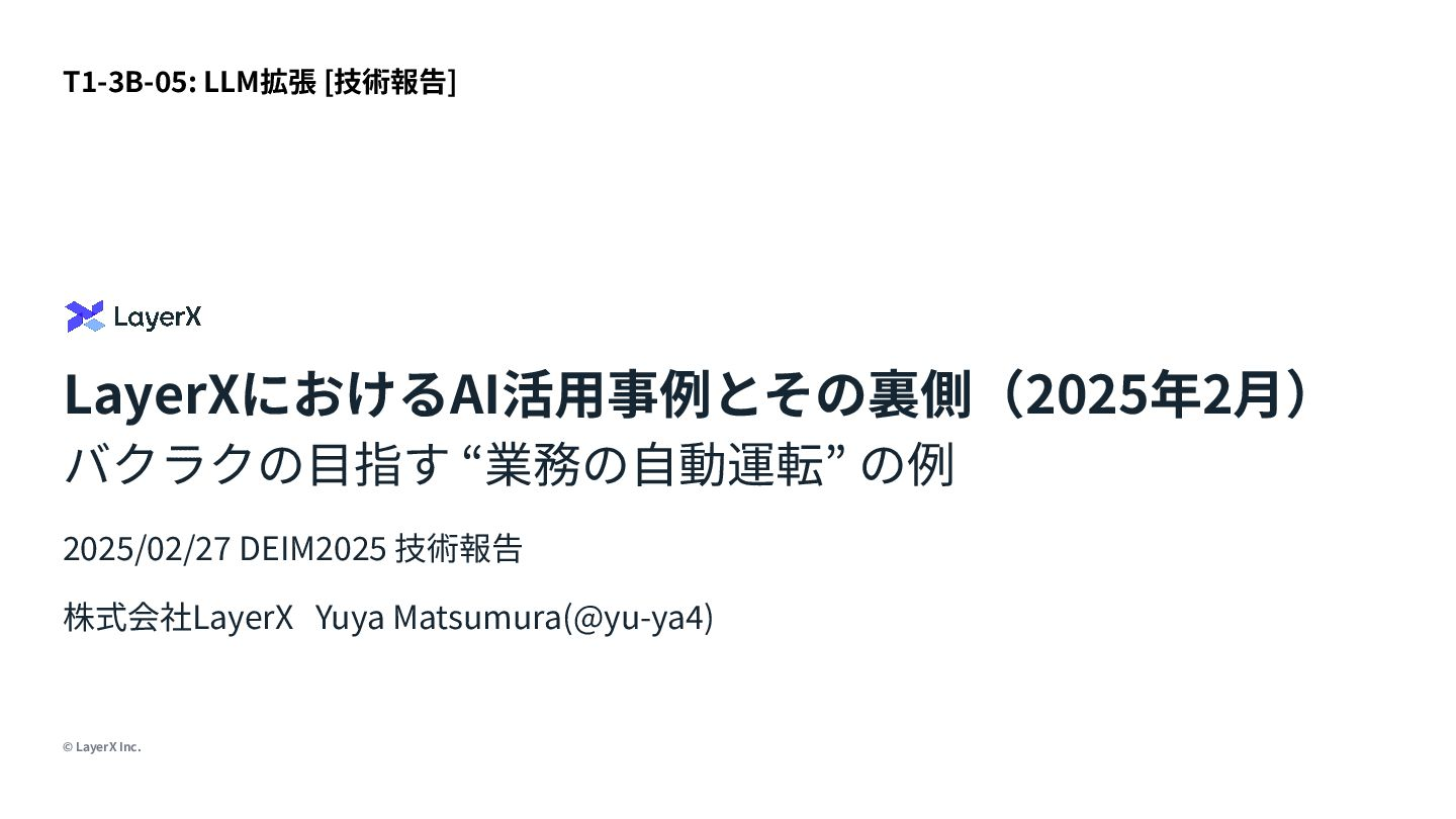 2025年2月27日 DEIM2025 (https://pub.confit.atlas.jp/ja/event/deim2025) における技術報告の資料です。 題目:『 LayerXにおけるAI活用事例とその裏側(2025年2月) バクラクの目指す “業務の自動運転” の例』 日程:2/27(木)16:00 〜 18:10([3B]LLM拡張) 発表者:松村 優也 プログラムリンク:https://pub.confit.atlas.jp/ja/event/deim2025/session/1RoomB11-15