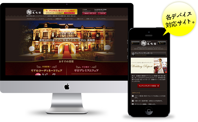 代官山に新しくオープンした「鳳鳴館」。代官山の「現代的なイメージ」と、大正ロマンという「古きよき日本」が新郎新婦に伝わる様、重厚感の溢れるデザインで踏襲。KPI(重要評価指数)を来館とし、来館予約を促す為にフェア等の情報をリアルタイムで更新するシステムを導入。多くの新郎新婦の来館に成功。