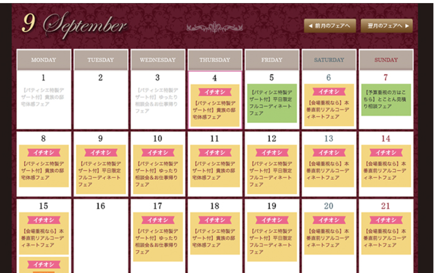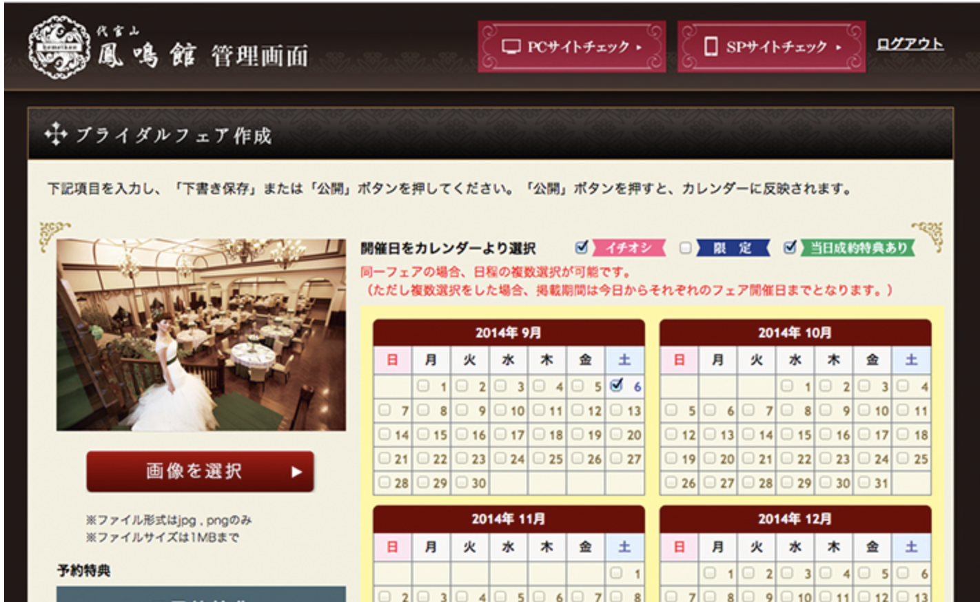季節や状況に応じて、フェアの状況を更新する事で、タイムラグなく、ユーザーに有益な情報を届ける事が可能。 また、ユーザーに対しては、予約の埋まり具合も公開でき、予約時に日時の指定まで可能。 また、式場の担当者にとっても、更新が自己で簡潔するため、余分なやりとりがなく、業務支援にも繋がっている。