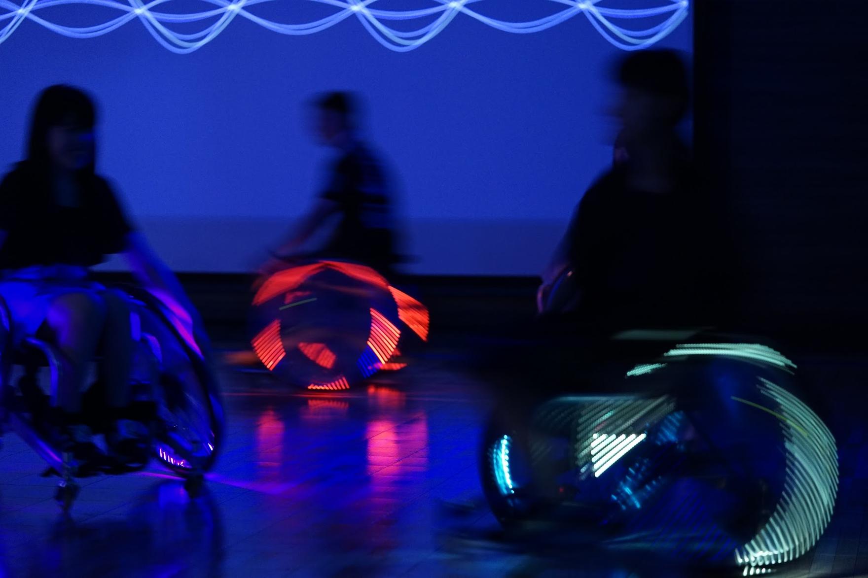 「PLAY THE WHEELS 音をかなでるクルマイス」は、Chiba City Media Art Projectによる、音と光の体験型のインスタレーション。LEDやスピーカー、センサーなどを繋げた競技用の車椅子のホイールを回転させると、体験者の動きに合わせて音をかなでることができます。スポーツを“PLAY”するための車椅子で、音楽を“PLAY”できるようにすることで、より多くの人に競技用車椅子に乗る楽しさを感じてもらえたらと考えて企画・制作をしました。