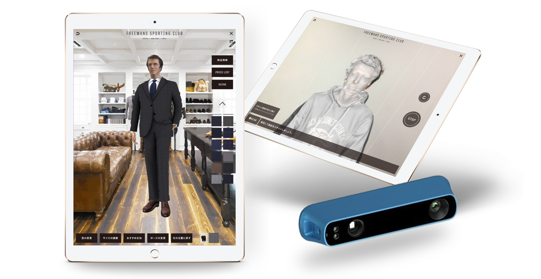 まるで実際にスーツを仕立てたかのように体に合わせ、生地の質感やカラーもリアルに表現したバーチャルフィッティング用アプリ。「Structure Sensor」 という3Dスキャナーをタブレットに取り付け、赤外線で身長などの体型を計測。あわせてリアルタイムでのテクスチャースキャンによって3Dでお客様の顔を表示し、お客様の雰囲気・スタイルにぴったりなスーツを選ぶことができます。スーツのオーダーメイドをより身近に感じ、楽しめるような体験をお届けします。