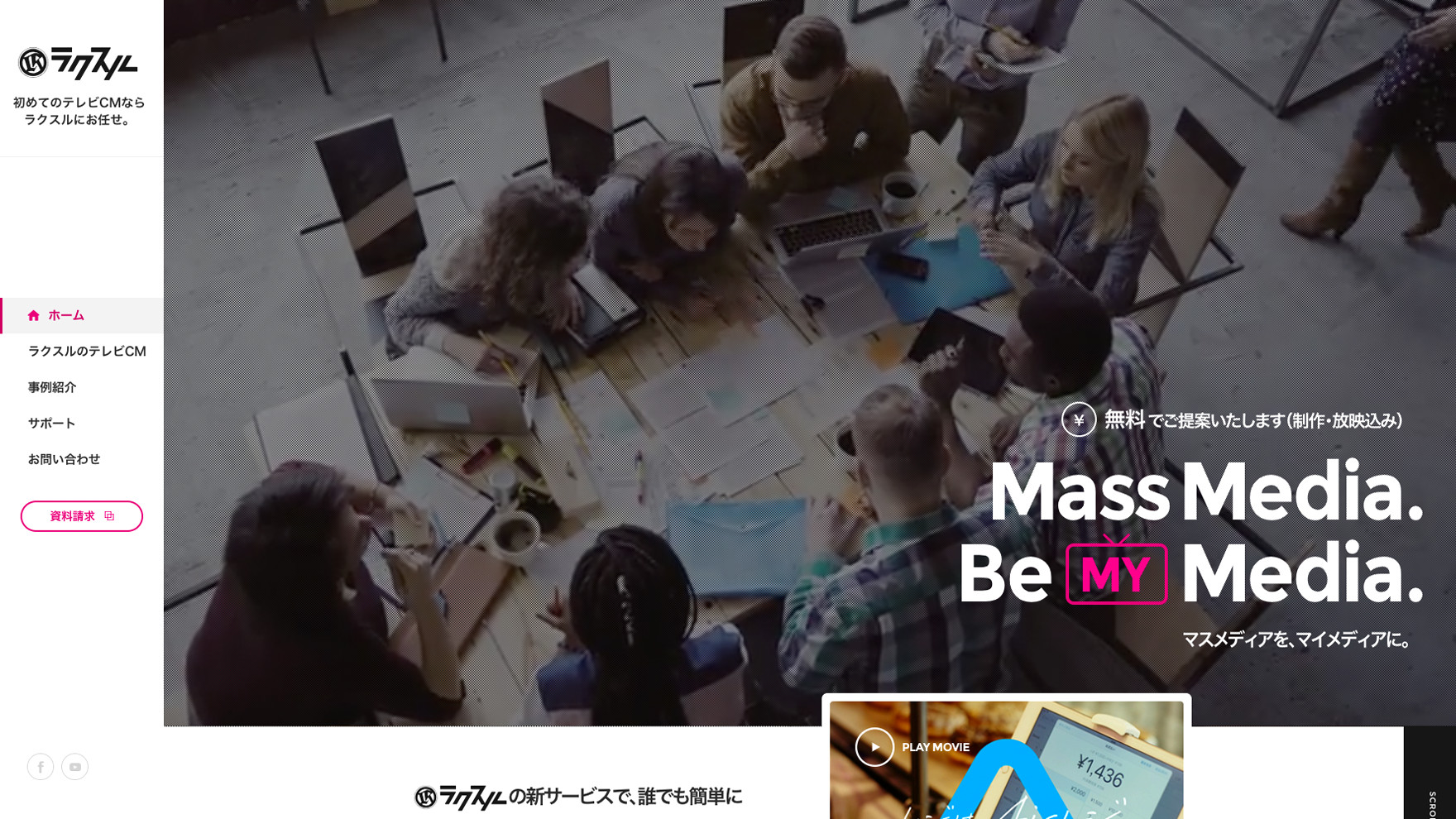 テレビCMが誰にでも手が届き、かつ効果が出るマーケティング手法であることを伝えるサービスサイトです。多くのテレビCMの実績を訴求することで、ユーザーに「自分でもCMを作れそう」と感じていただけるような見せ方にしました。マスメディアを、マイメディアに。