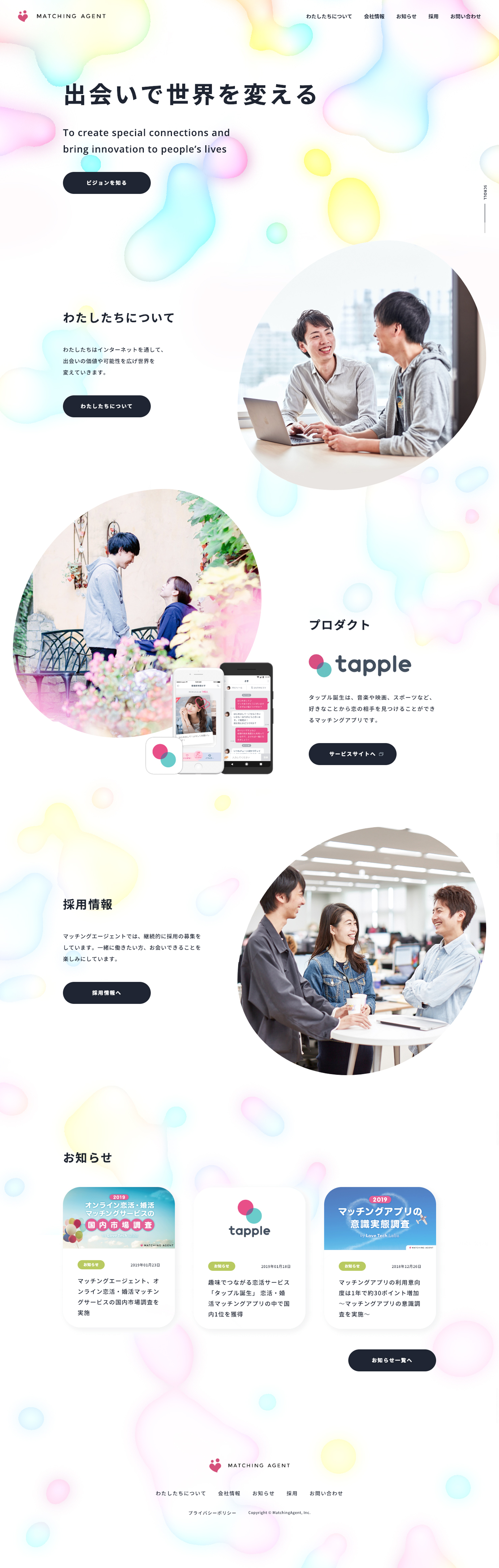 マッチングエージェント社のサイトリニューアルを実施。要件として自社サイトからの採用を目指していたため、他社との強い差別化要因である「社内文化」を伝える企業コピーをサイトコンセプトとして打ち出しました。コンセプト策定にあたっては、社内の主要ステークホルダーを中心に、ファシリテーションを中心としたリサーチと、言語化のサポートを実施。さらに、言語化された企業コピーをクリエイティブコンセプトにに昇華し、デザイン+実装により高度なレベルで視覚化しました。