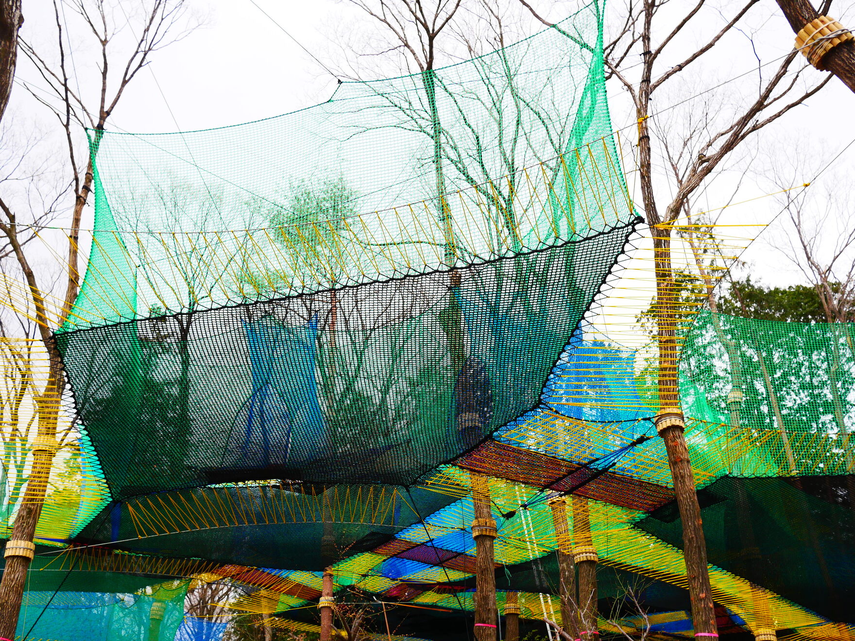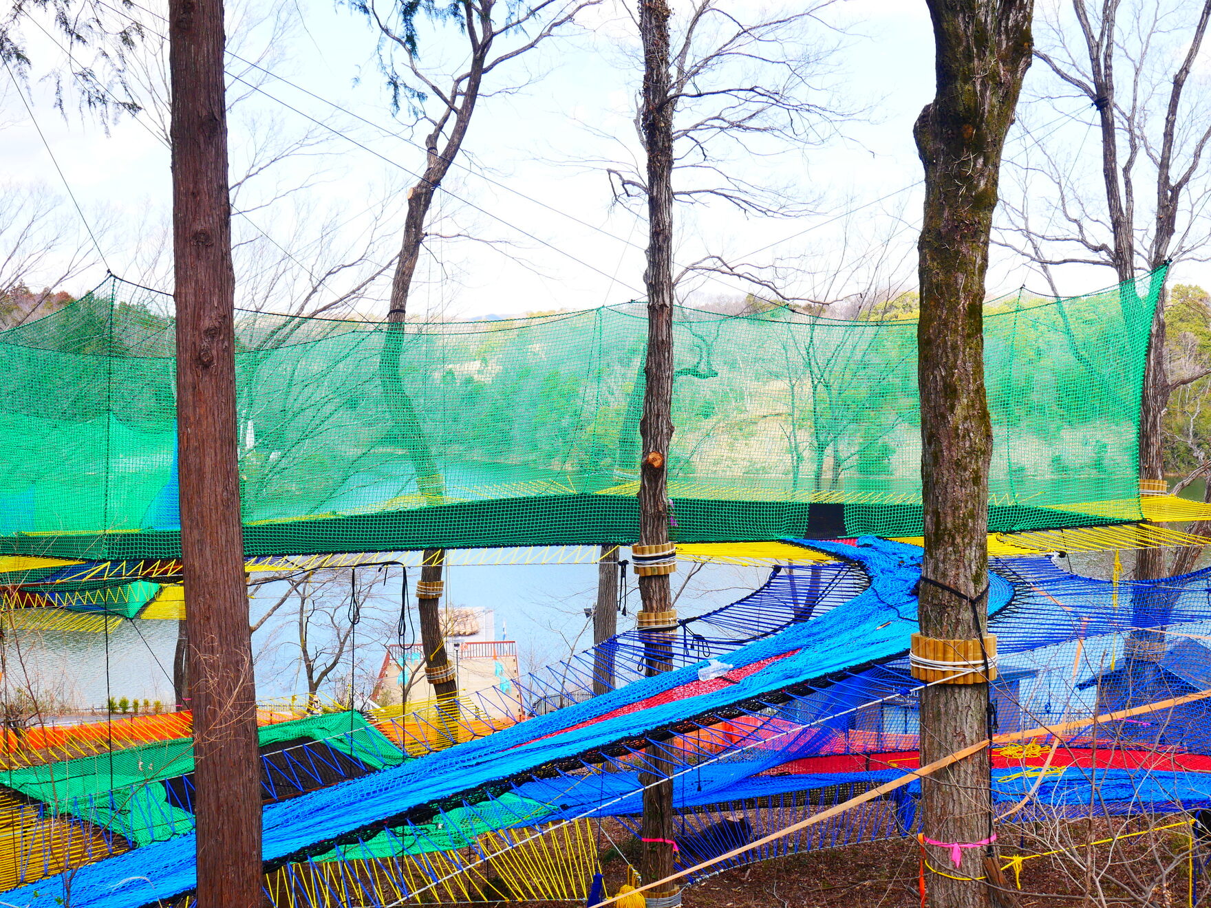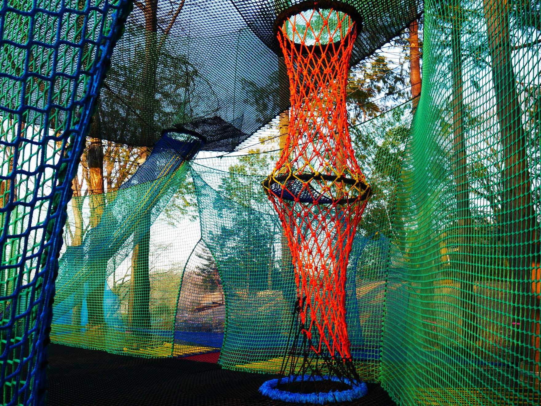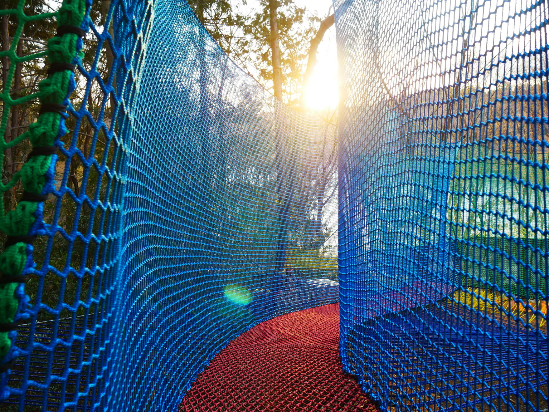 ファンモックは、古くから伝わる漁網技術などを独自に応用してつくられているネット製のアドベンチャー施設です。カラフルなネットが森の中に美しい造形を生み出します。子どもから大人まで、ハーネスもヘルメットもつけずに自由に跳ね回ることができます。地上では味わえない感覚を楽しむことができます。