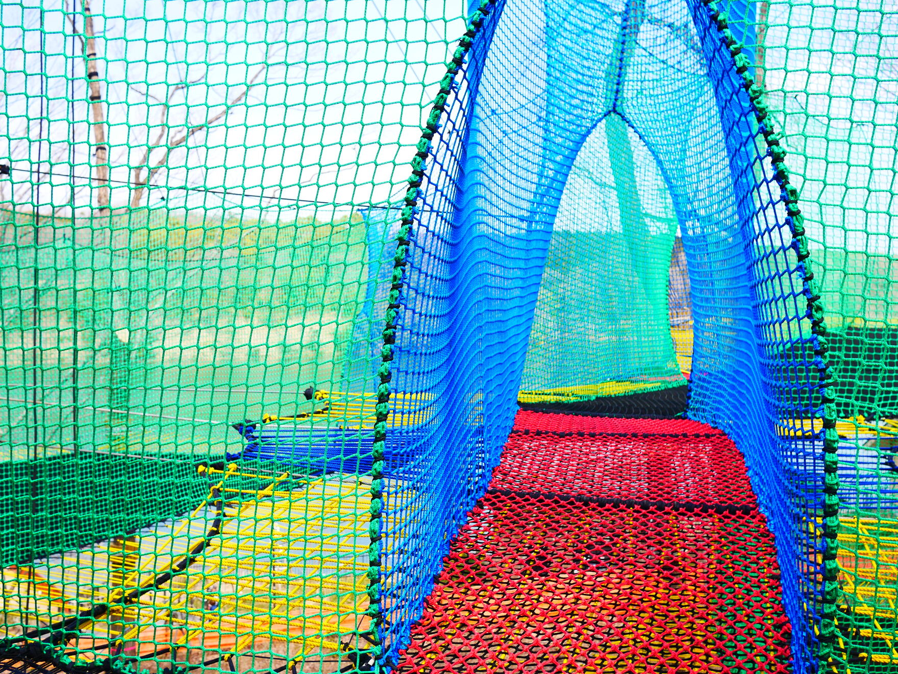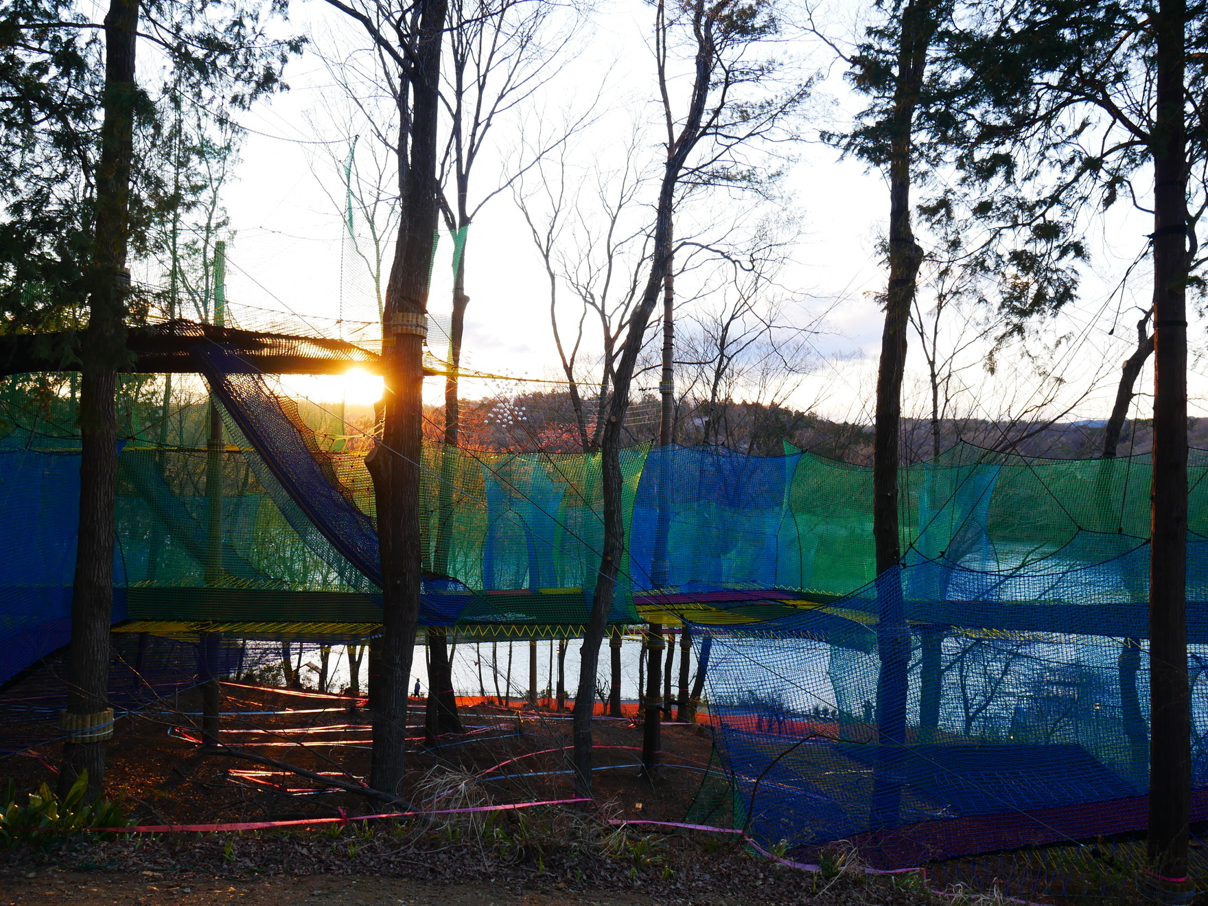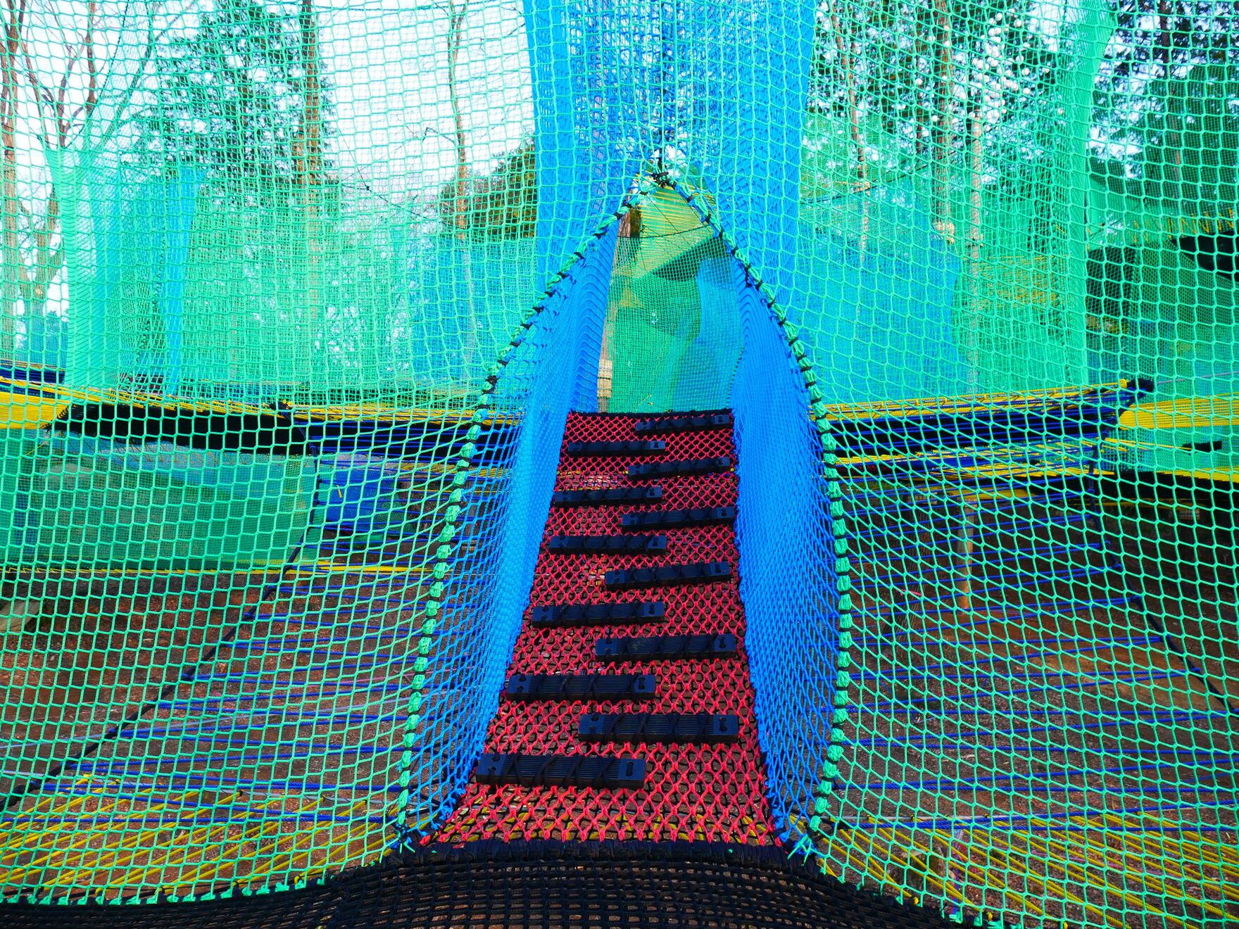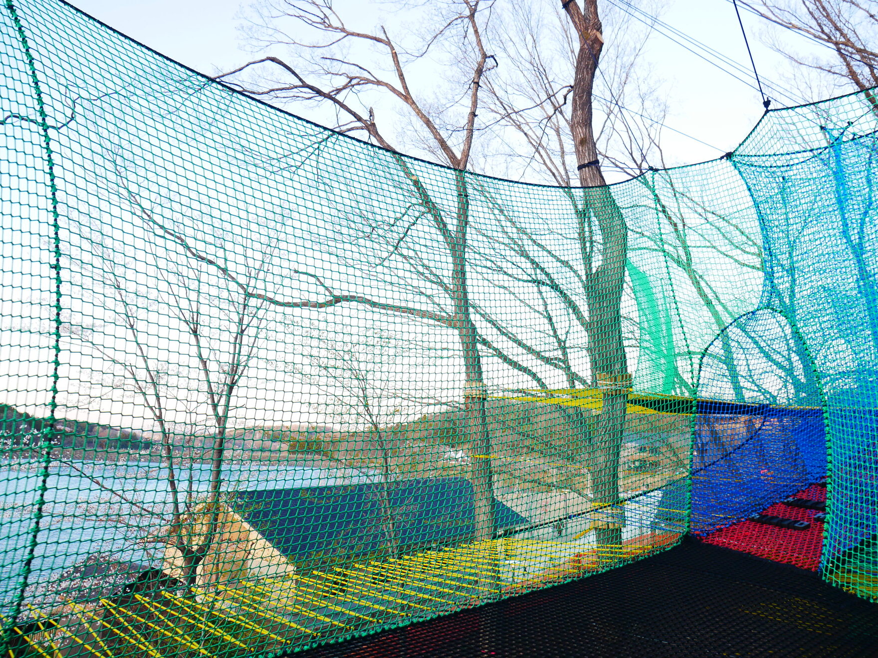 ファンモックは、古くから伝わる漁網技術などを独自に応用してつくられているネット製のアドベンチャー施設です。カラフルなネットが森の中に美しい造形を生み出します。子どもから大人まで、ハーネスもヘルメットもつけずに自由に跳ね回ることができます。地上では味わえない感覚を楽しむことができます。