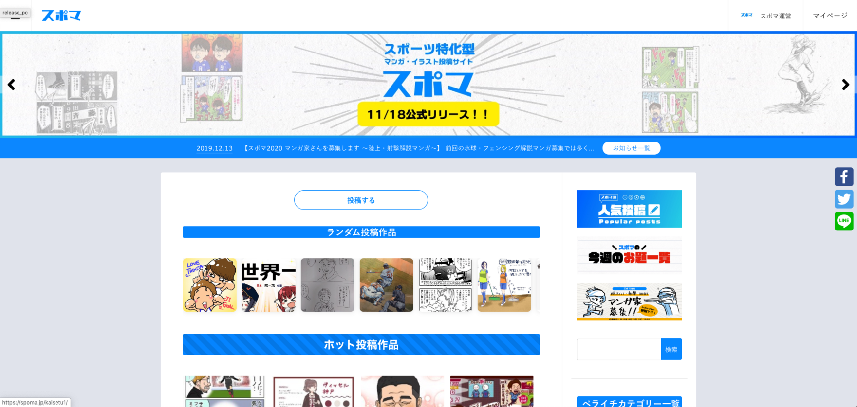 スポーツ特化型マンガ・イラスト自由投稿サイト「スポマ」。