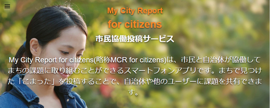 My City Report for citizens(略称MCR for citizens)は、市民と自治体が協働してまちの課題に取り組むことができるスマートフォンアプリです。まちで見つけた「こまった」を投稿することで、自治体や他のユーザーに課題を共有できます。