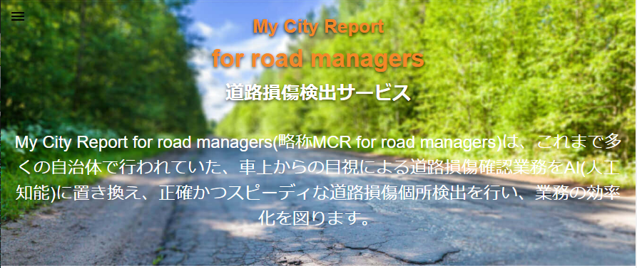 My City Report for road managers(略称MCR for croad managers)は、道路損傷確認業務をAI(人工知能)に置き換え、正確かつスピーディな道路損傷個所検出を行い、業務の効率化を図るサービスです。