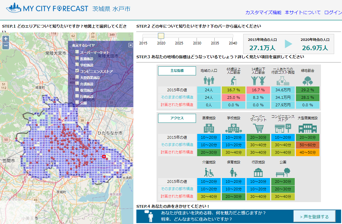 MyCityForeastは、現状の人口分布・施設配置データをもとに、2015年~2040年に想定される居住地域の環境を可視化するものです。簡易なシミュレーションを通し、将来その通りの都市構造になった場合に市民が暮らす環境がどう変わるのか?を14の指標を通して表示します。