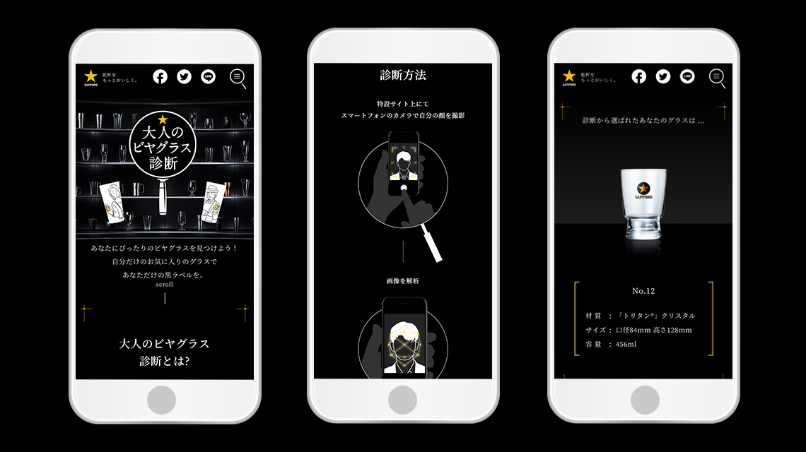 20~30歳のライトユーザーに向けて、「サッポロ生ビール黒ラベル 43種から選べるビヤグラスプレゼントキャンペーン」を盛り上げるデジタル施策を企画・制作。WEBサイト上で自分の顔写真を撮影すると、画像分析のAPIと独自診断ロジックから最適なグラスをレコメンド。43通りの診断結果別オリジナルイラストとタイプ診断によって、リッチなコンテンツに仕上がった。また、個別の診断結果をSNSでシェアできるようにすることで、コンテンツの拡散やキャンペーンへの送客を意識した設計も行った(現在は公開を終了)。
