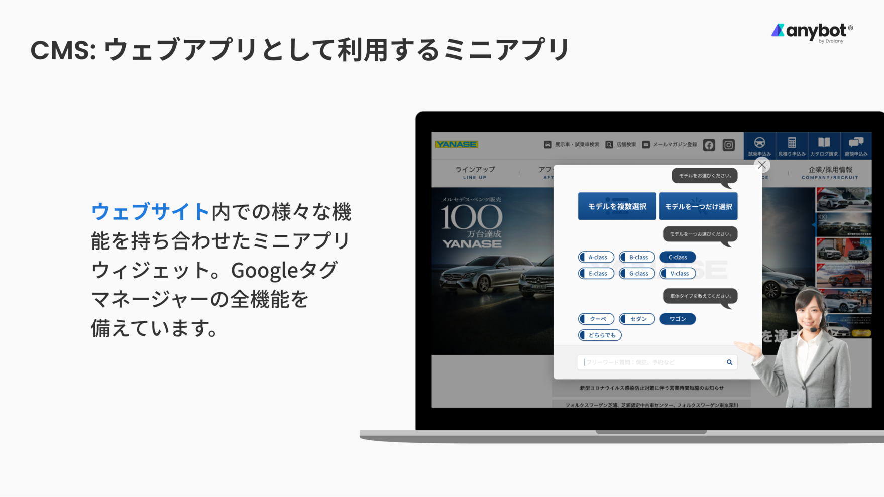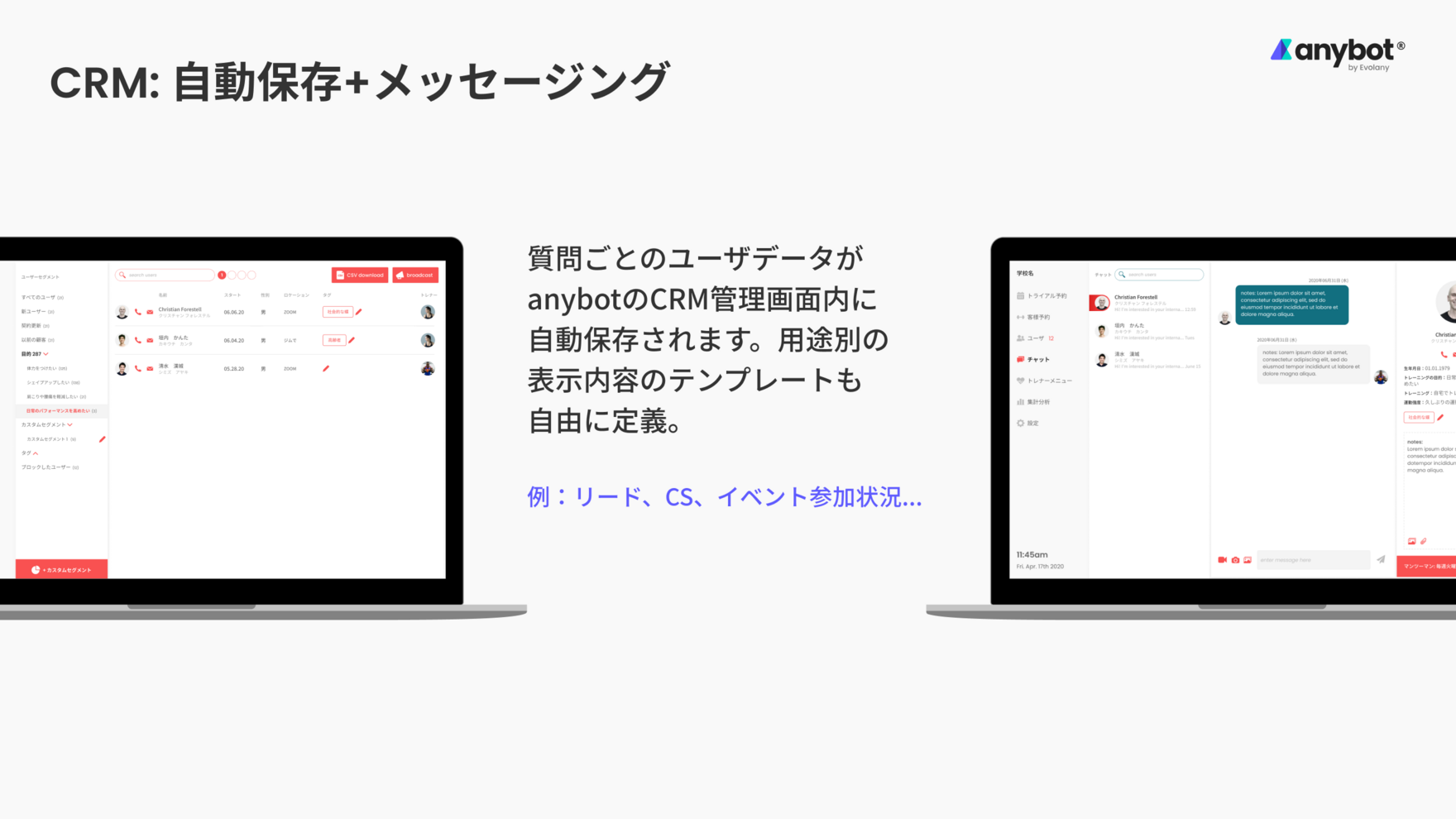 anybot(エニーボット)はLINE/Messenger/電話/メールを統合した自動接客のオムニチャネル。無料チャットボット(Chatbot)を始め、CRMでユーザデータを自動管理・グループ化、EC/予約用のミニアプリでビジネス活動・業務自動化をフルサポートします。