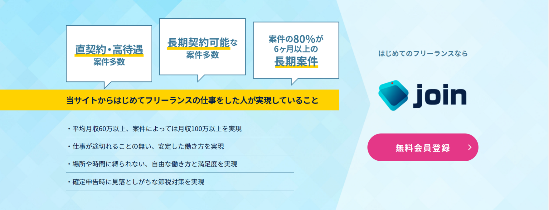 フリーランスエンジニア向けに、幅広い案件のご紹介、税務・法務サポートを行うエージェントサービスです。すでにエンジニアとしてのご経験をお持ちの方だけでなく、はじめてフリーランスエンジニアになる方も多く在籍しており、joinを通して多くの方のキャリアアップを支援しています。