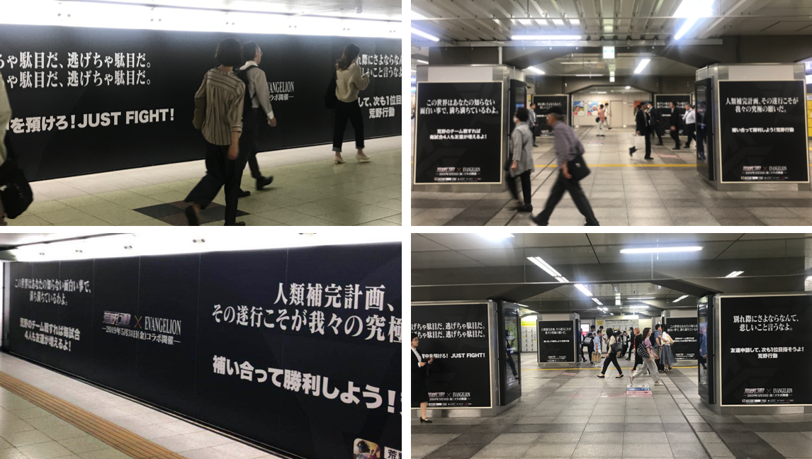 人気ゲームアプリと人気アニメシリーズのコラボイベント時の屋外広告。アニメの有名セリフを大胆に用いて、ゲームのチームプレイ機能の魅力を訴求。