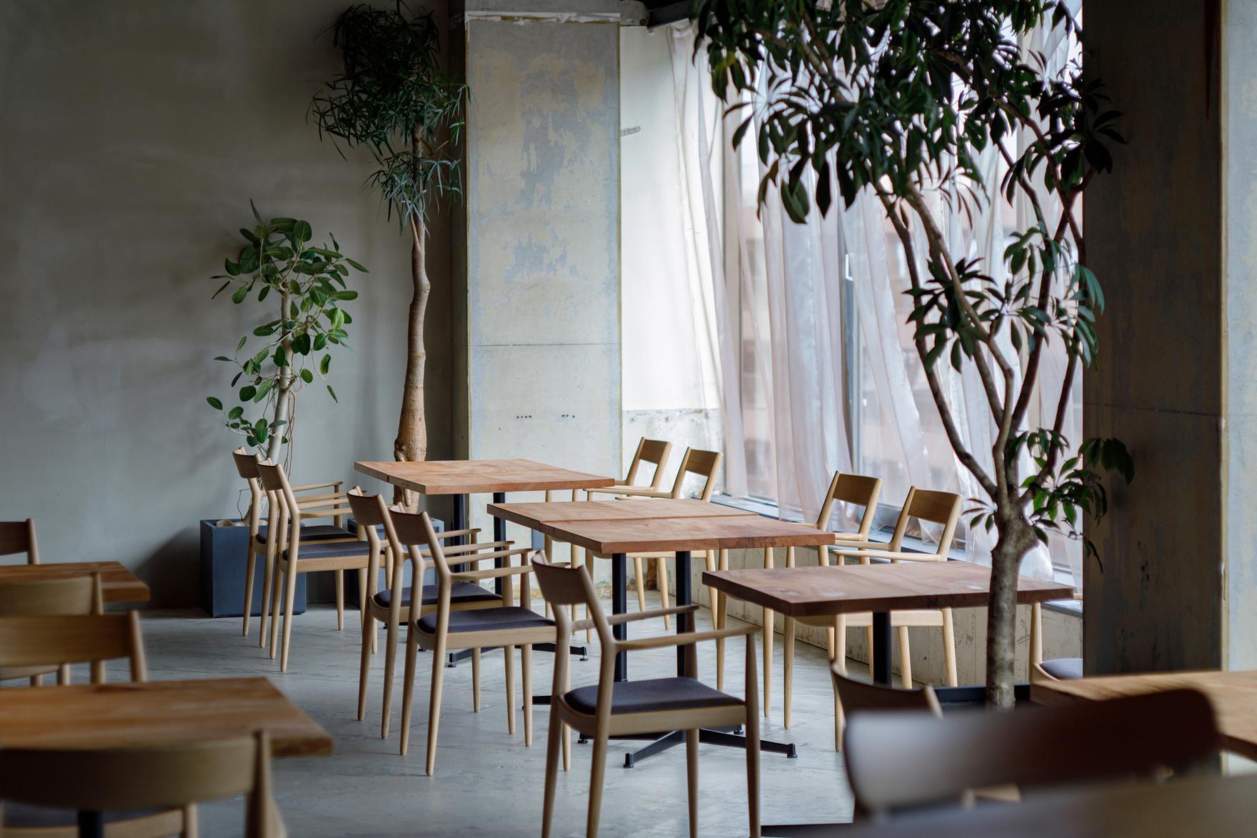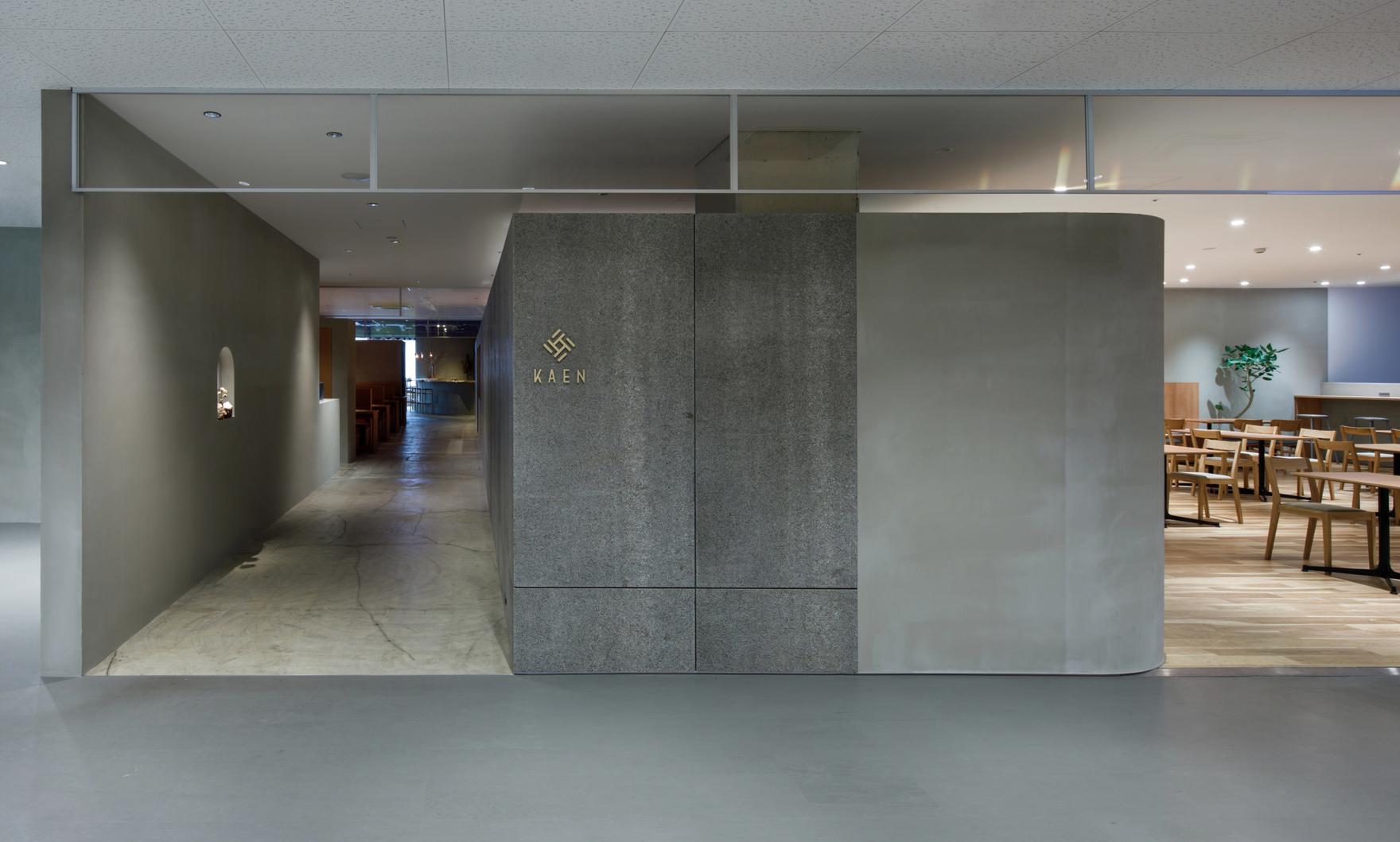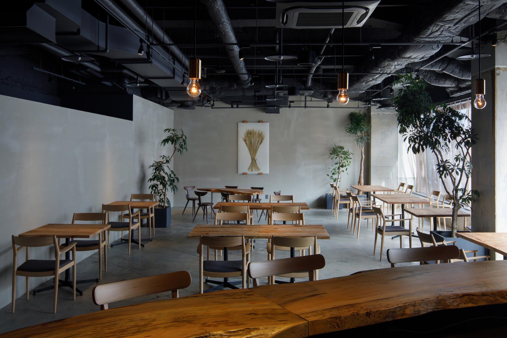 KAENは暖炉と薪窯を使用し、薪の火を熱源とした原始的な調理方で、素材を活かして丁寧に調理するレストランです。ローカルファーストを意識した運営者のこだわりを空間にも落とし込めないかと考えました。新しく作る部分は最小限にとどめ、その中に、鳥取で長年無垢の木を扱ってきた澤太一郎の無垢の木で作ったカウンターとテーブルを配置することで丁寧で温かみのある空間をデザインしました。