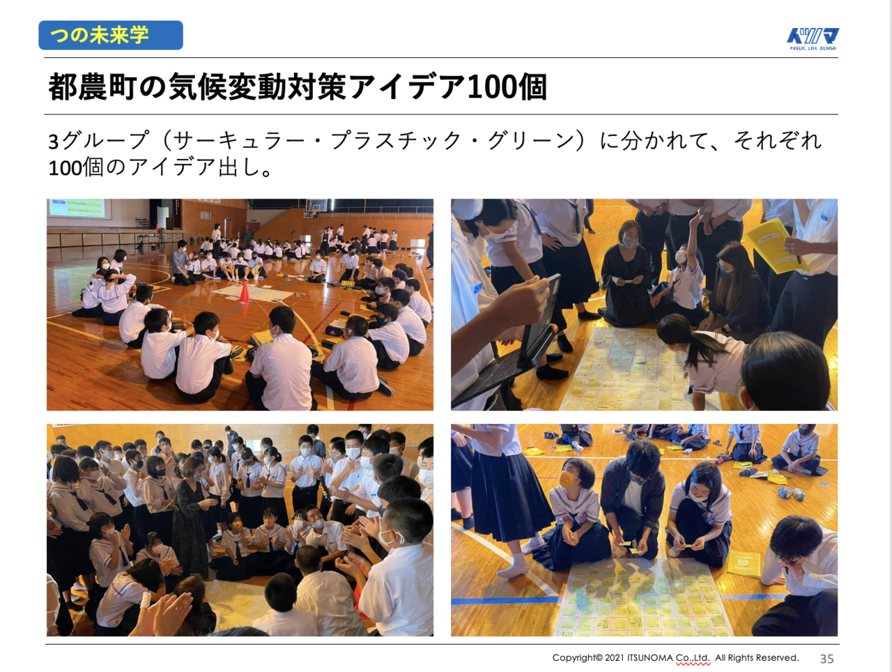 各学年の総合学習の時間、年間15時間を使い「つの未来学」と称して、1つの地域課題テーマを当事者と考え、解決アイデアを出し、アクションまで起こすプログラムを企画、実施中です。