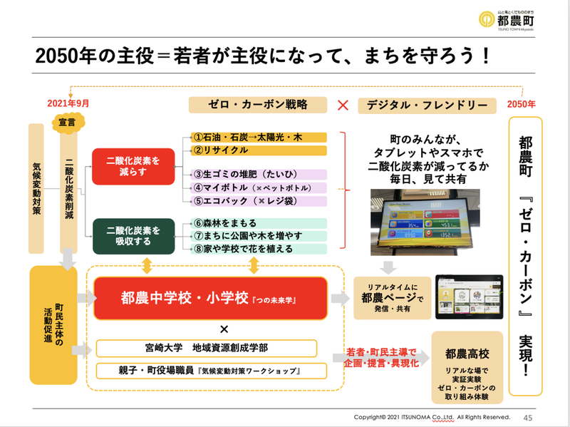 小・中学生における、気候変動対策アイデアの話を町長や町議会に共有、その後、町としても2050年に向けて『ゼロ・カーボン宣言』を出し、具体的なアクションを小・中学校と共同で進めていくことに!
