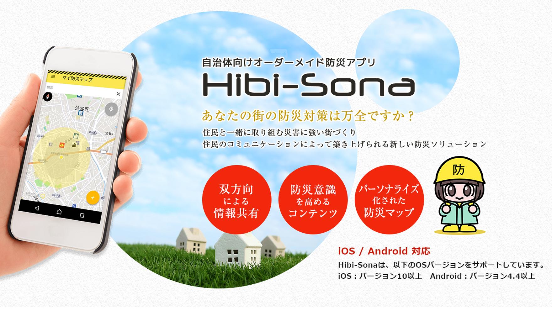 住民の防災意識の向上と見える化を実現する自治体様向けオーダーメイド防災アプリです。災害に日々(Hibi)、備える(Sona)でHibi-Sonaです。自治体と住民との防災意識や災害時のコミュニケーションを円滑に行える機能を搭載しており、災害時の自治体コミュニティに寄り添った情報の伝達が可能なアプリとなっています。