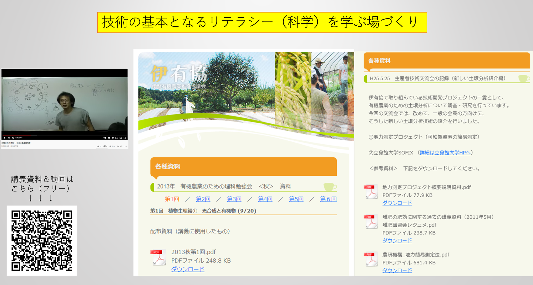 地域の生産者や研修生を対象に、農業を行っていく中で必要となる、植物生理や土壌肥料などの基本を学ぶための講座です。phとは何?石灰苦土加里ミネラルバランスをどうする?有機物の肥効をどう考える?といった、理解しておくとそうでないとでは栽培技術がガラッと変わる知識やノウハウを伝えました。