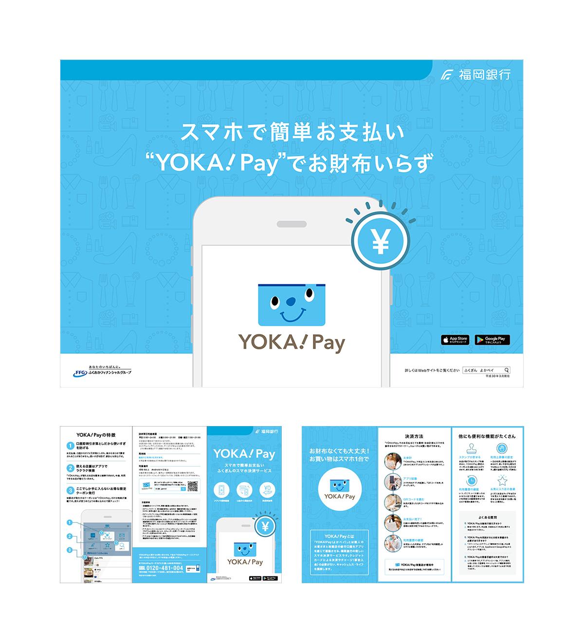福岡銀行さまのスマートフォン用決済アプリサービス「YOKA!Pay」を紹介するWebサイト、パンフレット、店頭設置用のぼり、ポスター、リーフレット、プロモーション動画を制作いたしました。