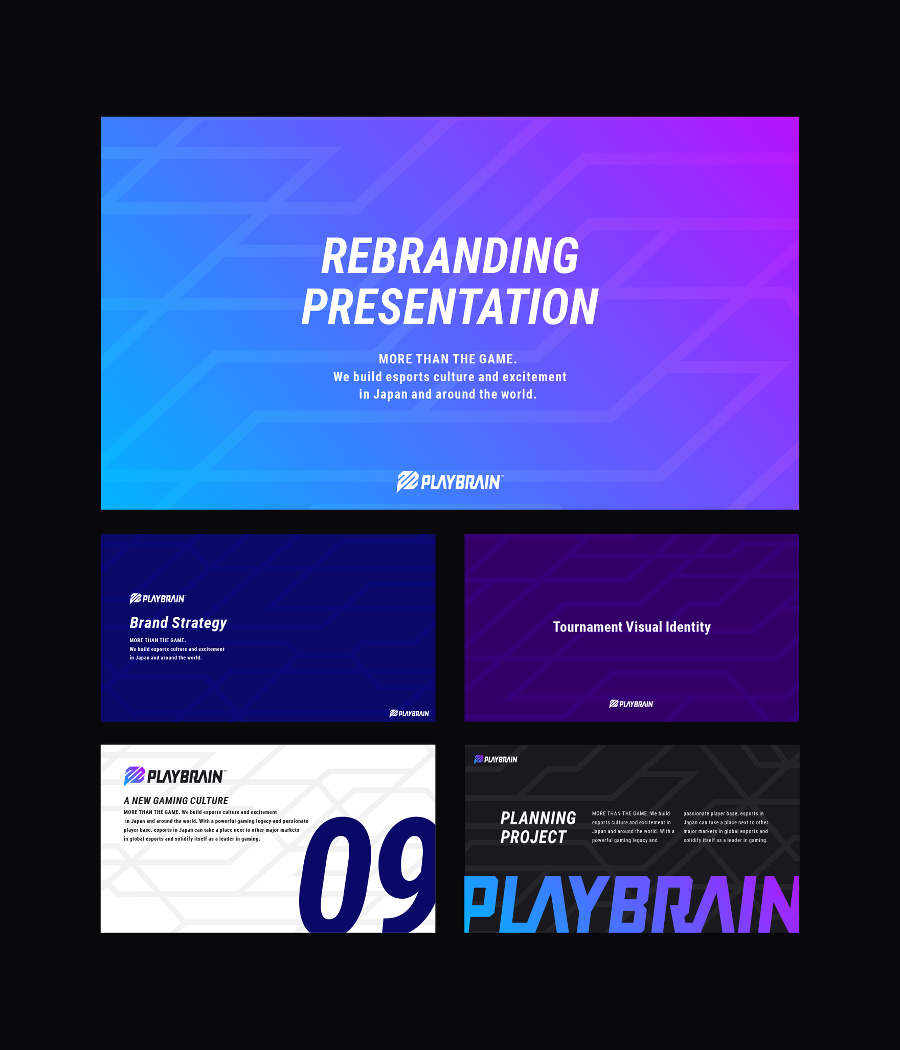 PLAYBRAIN is an agency and communication company that enhances the Japanese game industry. It was very important for their identity rebrand to be smart and playful, yet stand out on the gaming and live streaming screens. This playful “P” symbol was created by fusing “P” and “BRAIN”. The symbol drawn with lines looks like a circuit or a thunderbolt, and it also expresses PLAYBRAIN’s fast action and momentum in the game industry. We have carefully considered colour, shape, and thickness to create a design and variation that will stand out in any situation.