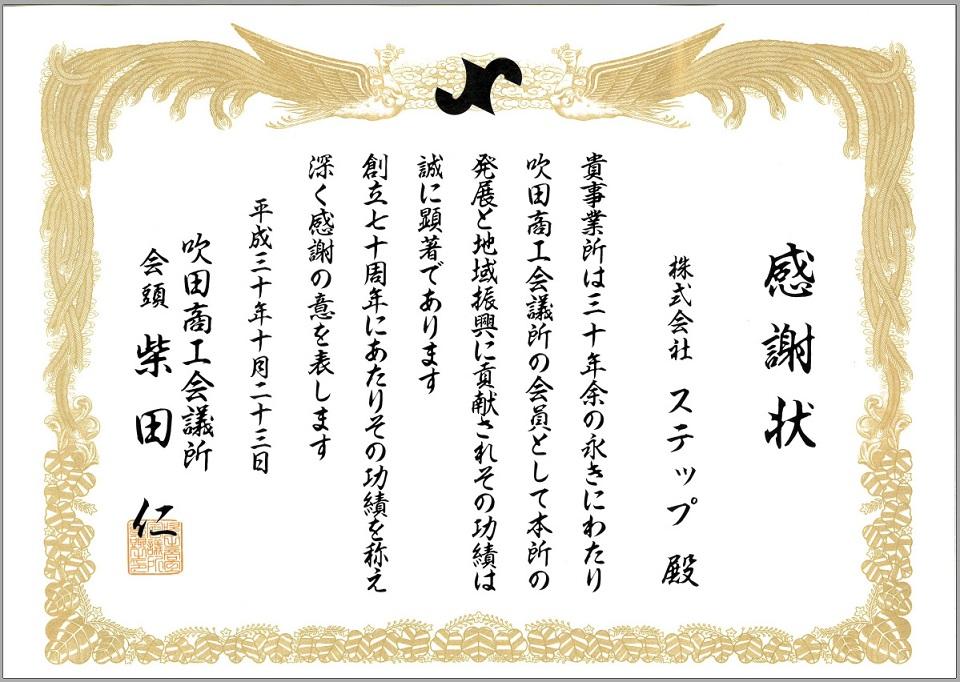 吹田商工会議所創立70周年記念にて、会員歴30年以上「永年会員表彰」として感謝状をいただきました!