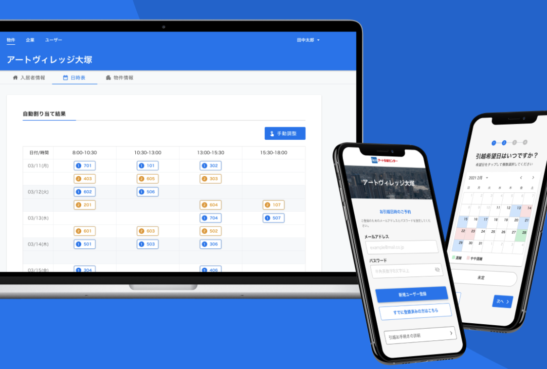 引越業界のリーディングカンパニーであるアート引越センターからアイスリーデザインにご依頼いただいたのは、一斉入居の日程調整のデジタル化。新築マンションの引越は、通常の引越とは異なり、一度にすべての入居者がバラバラに引越を行なってしまうと大きな混乱が生じてしまいます。そのため幹事となる会社がそれぞれの入居者と引越日時の調整を行うのが「一斉入居」です。マンション一斉入居サービス MSSは、一斉引越に関わる手続きをデジタル化することで入居者さまへのサービス向上と関係会社業務効率化を目的として開発したサービスです。弊社ではUIUXデザインからシステム開発まで一貫して実施させて頂きました。