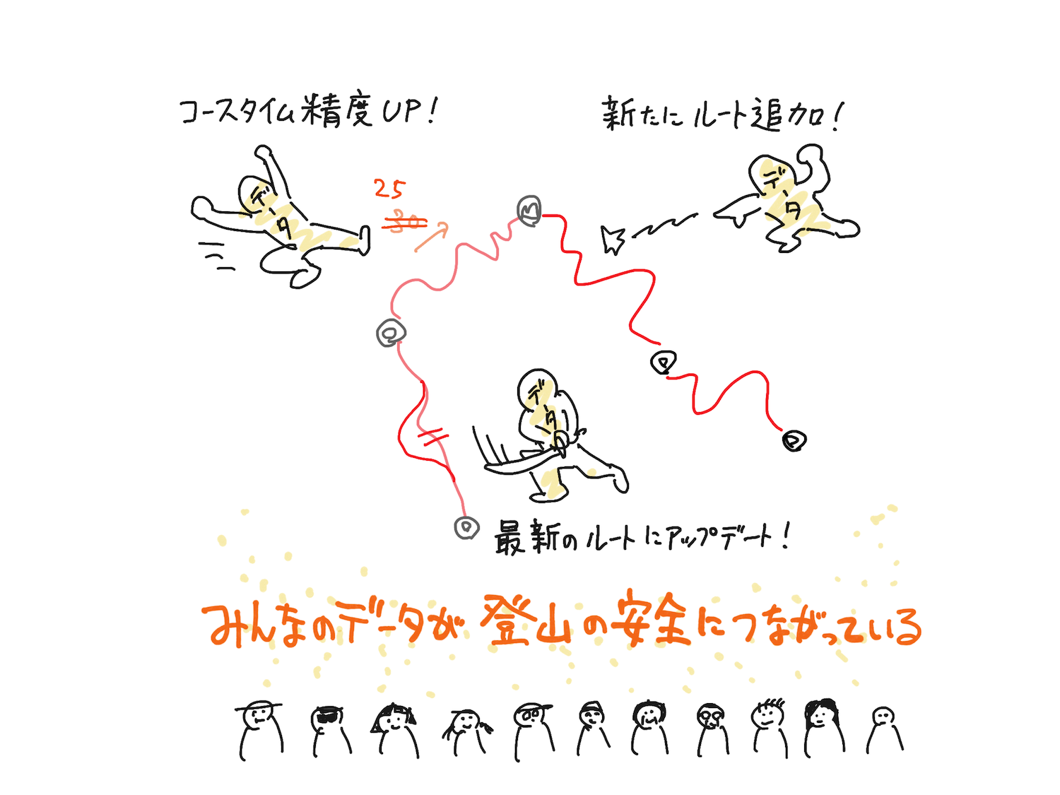 登山者の軌跡データから新規ルートを抽出し、地図に反映していくー。