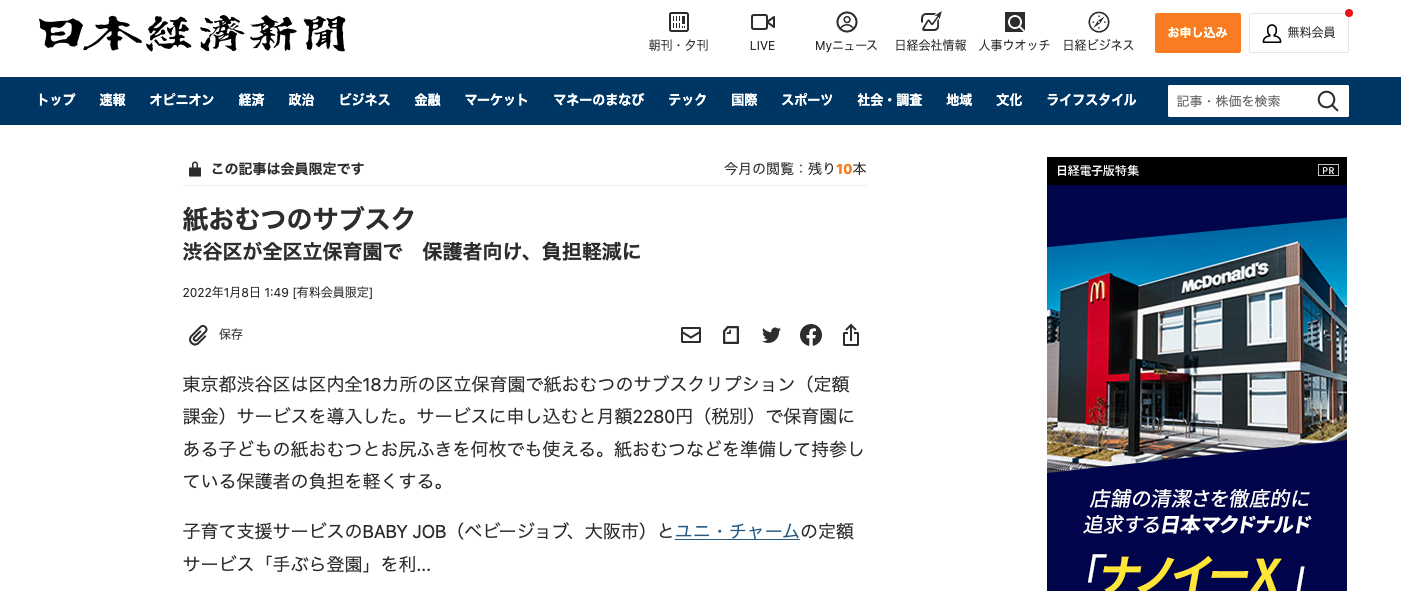 2022年1月8日に日本経済新聞電子版と日本経済新聞首都圏版「紙おむつのサブスク 渋谷区が全区立保育園で 保護者向け、負担軽減に」の見出しでBABYJOBが提供する手ぶら登園サービスが紹介されました。