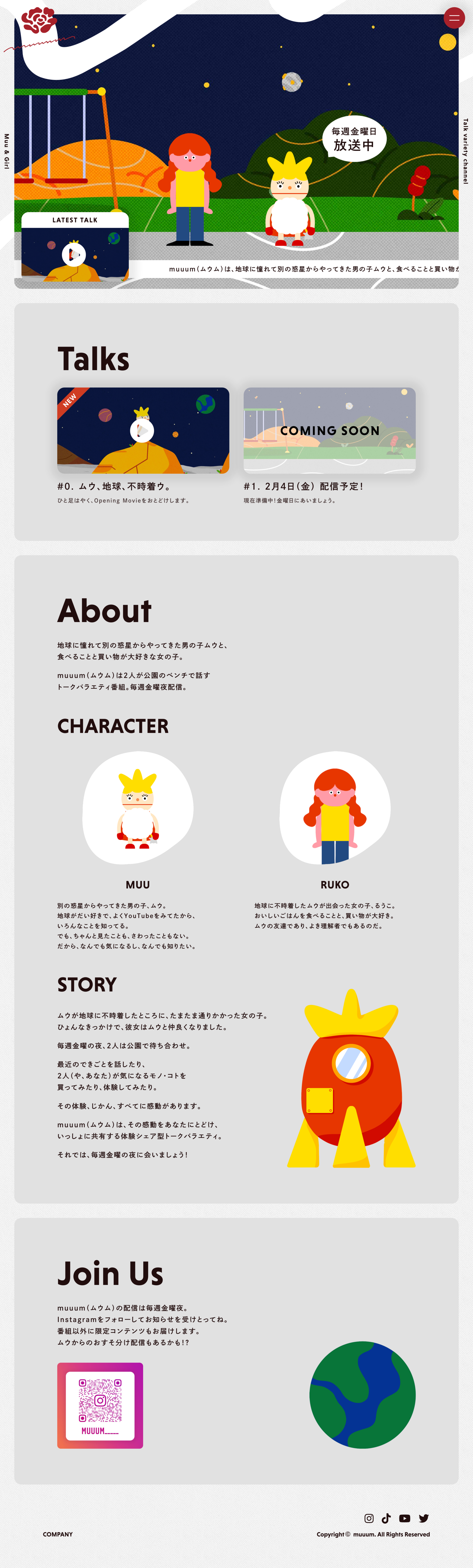 地球に憧れて別の惑星からやってきた男の子ムウと、食べることと買い物が大好きな女の子。muuum(ムウム)は2人が公園のベンチで話すトークバラエティ番組。毎週金曜夜配信。