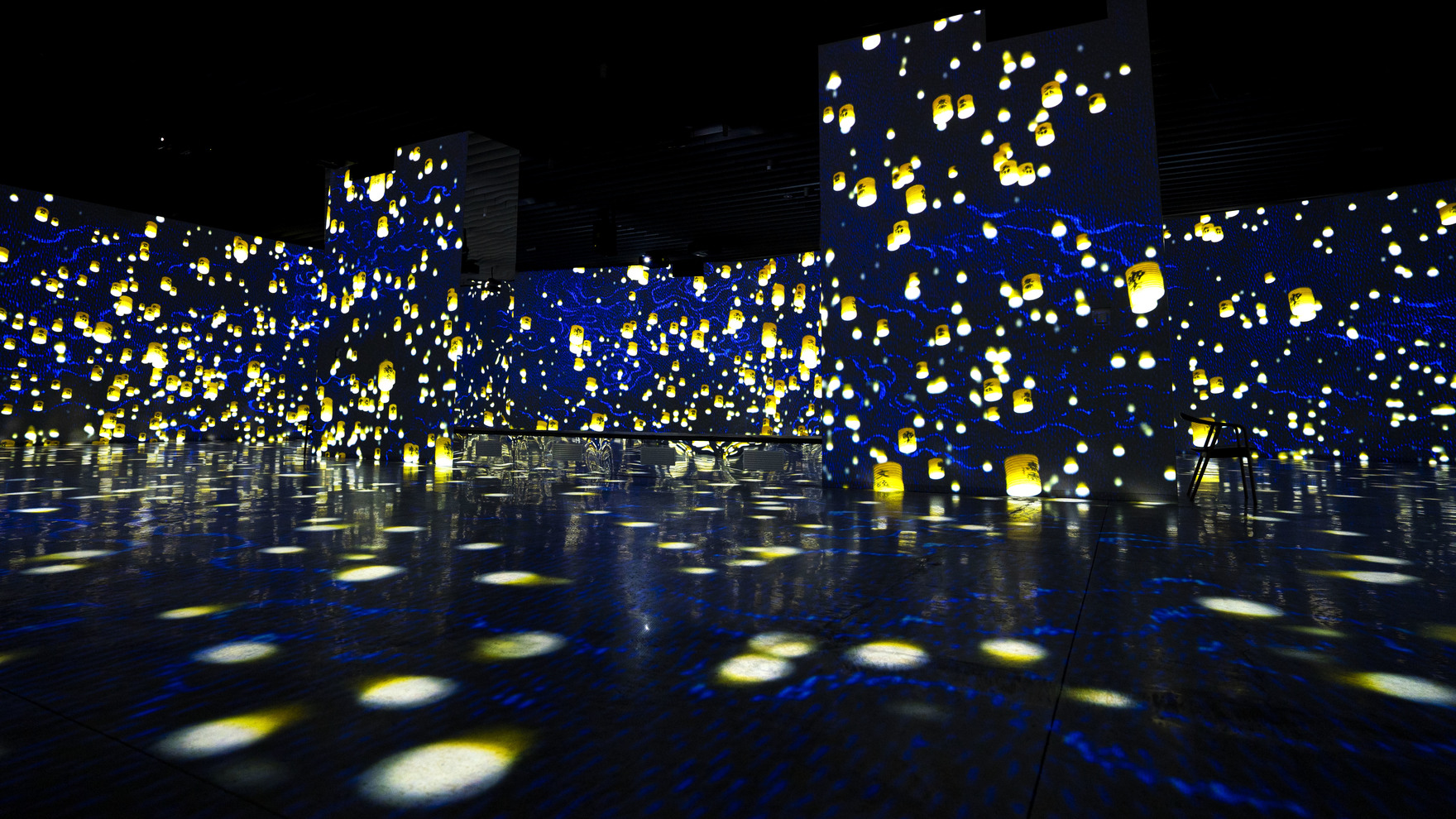 独自開発アプリケーションを使用し、映像空間での体験を効果的にするためのプロジェクターの設置設計を行いました。3DCGの中で「空間デザイン」と「プロジェクター設置設計」をシームレスにビジュアル化することで、検証はもちろん、海外アーティストをはじめプロジェクトメンバーとのコミュニケーションも円滑にし、リアルな映像空間での体験をより効果的なものにしていきました。