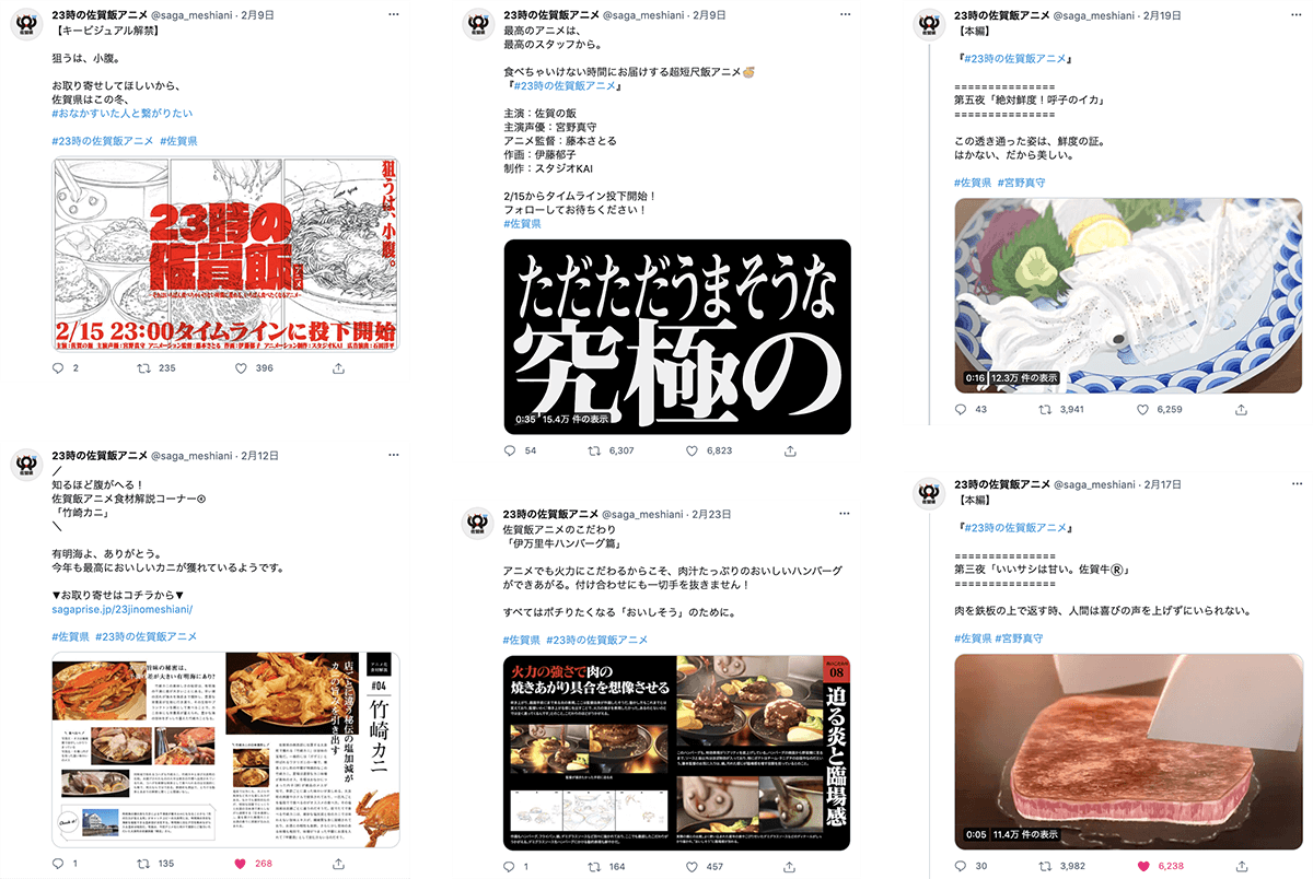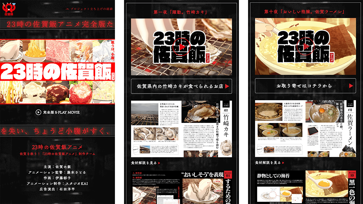 佐賀県が誇る様々な食の魅力を余すことなく伝える超短尺食アニメ。つい小腹の空いてしまう深夜23時から、 10日間連続でTwitterのタイムラインに投稿し続けるプロモーションを実施しました。 D2C dotではプロジェクト全体プロデュースから公式Twitter運用、公式サイト制作、PRコンテンツ制作、原画展まで幅広く担当しました。