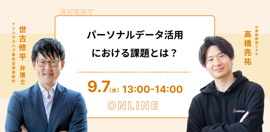 参画弁護士の世古が、株式会社Acompanyの主催するオンラインイベントにおいて、パーソナルデータの利活用およびその実務上の課題をテーマに登壇します。