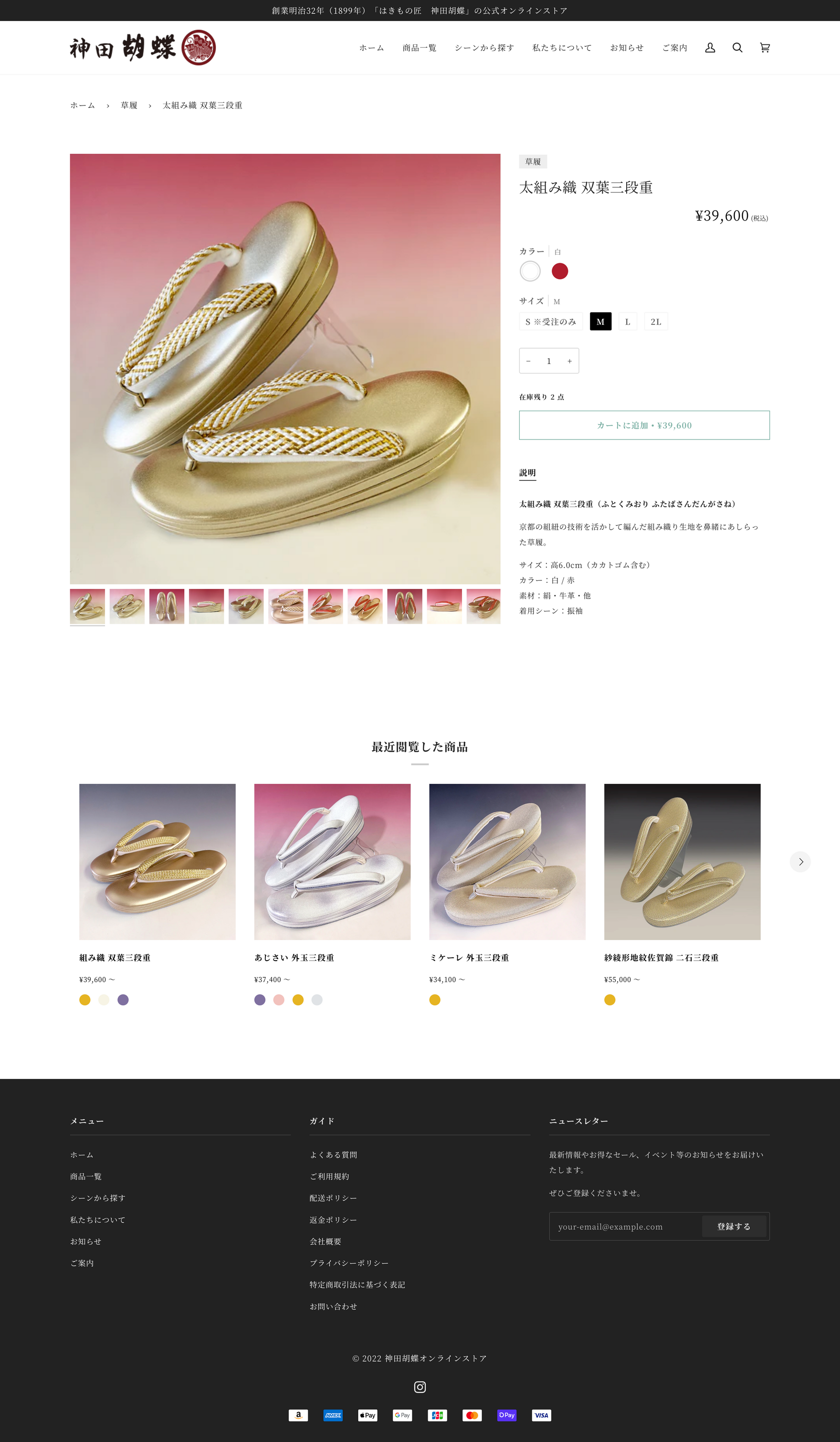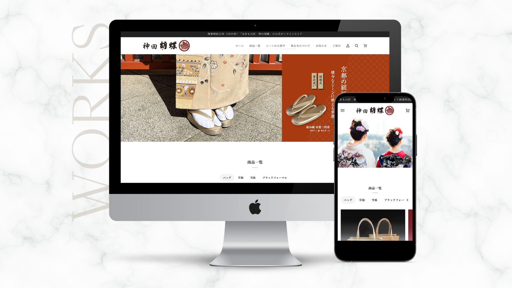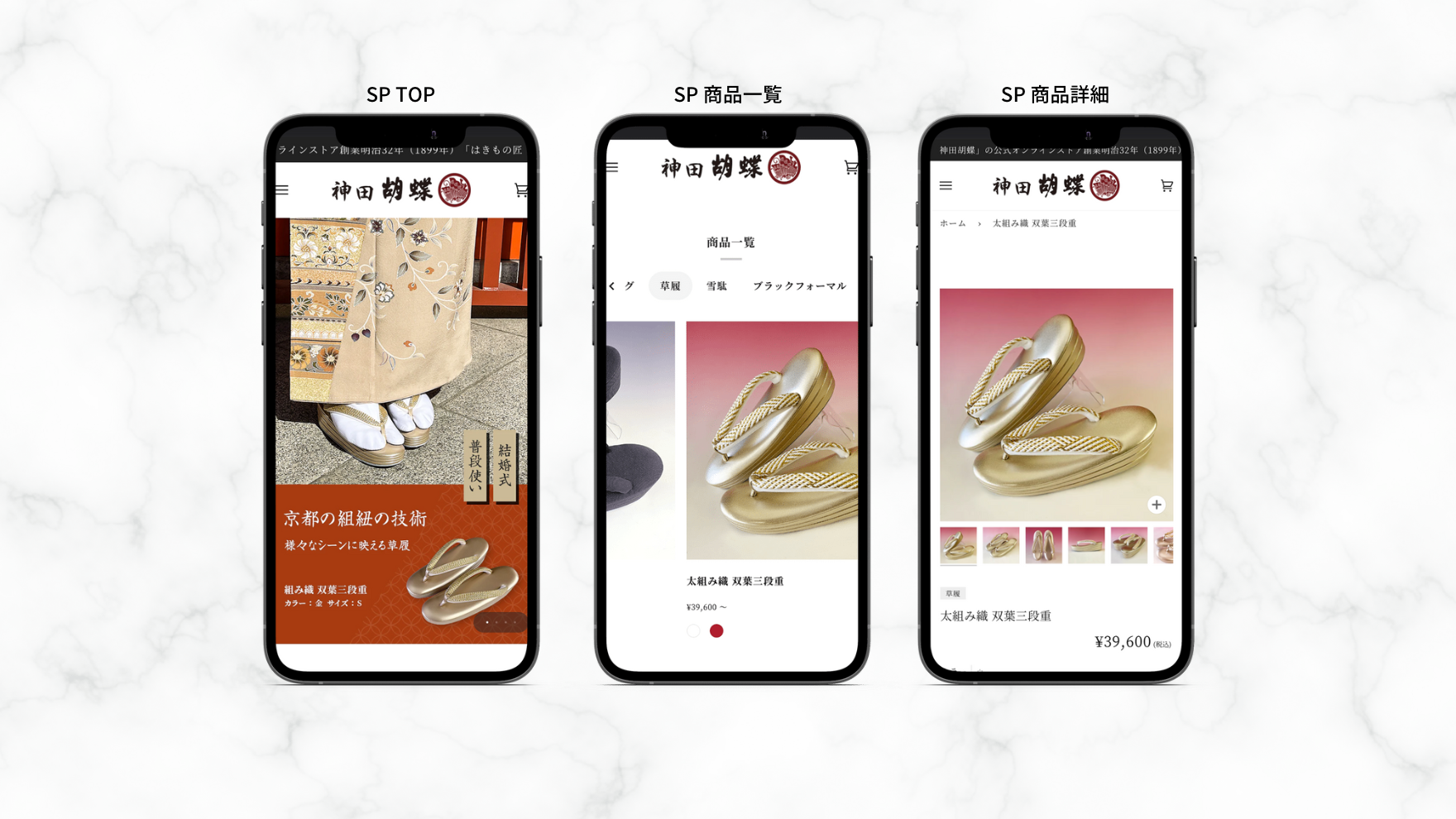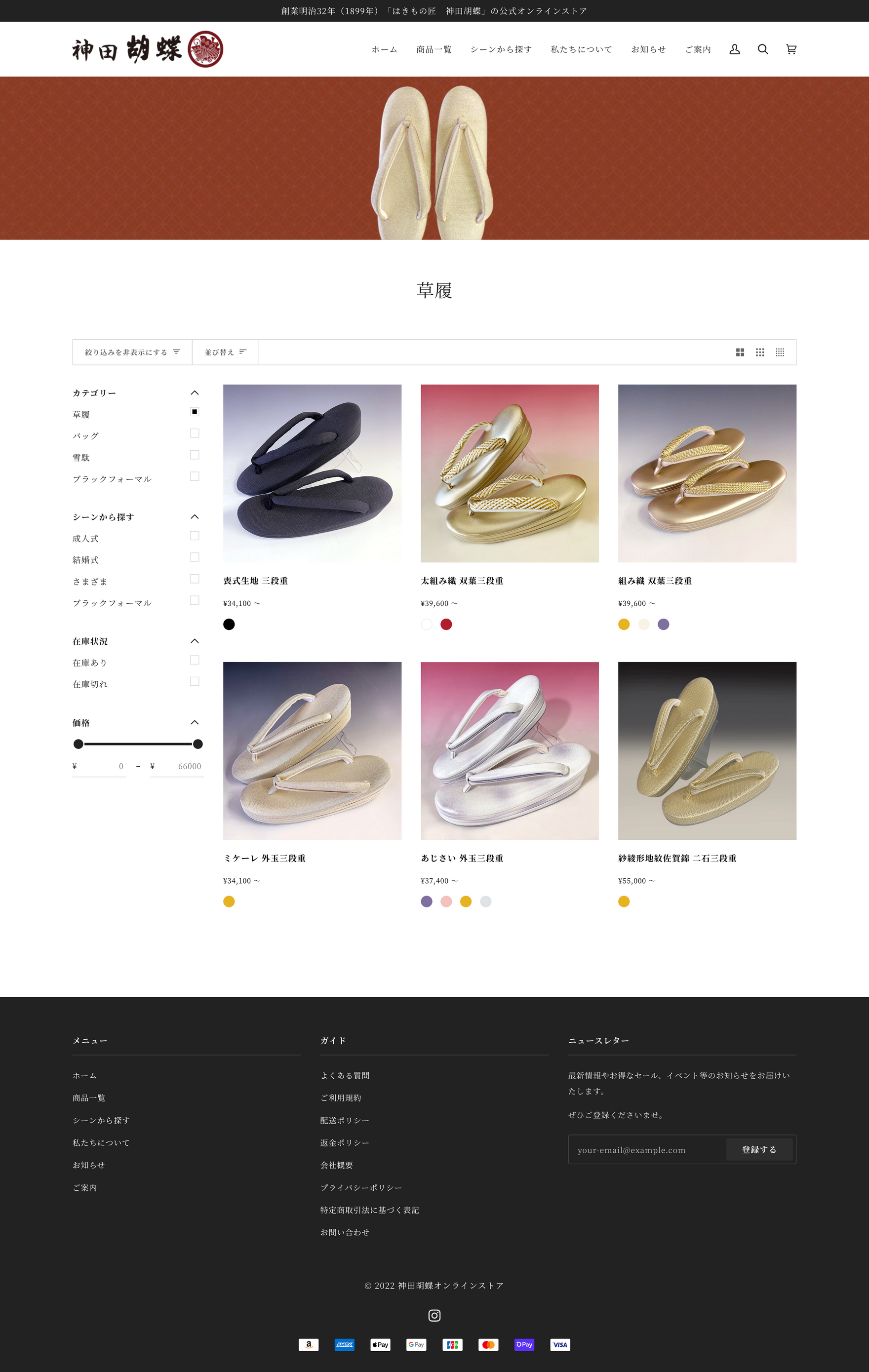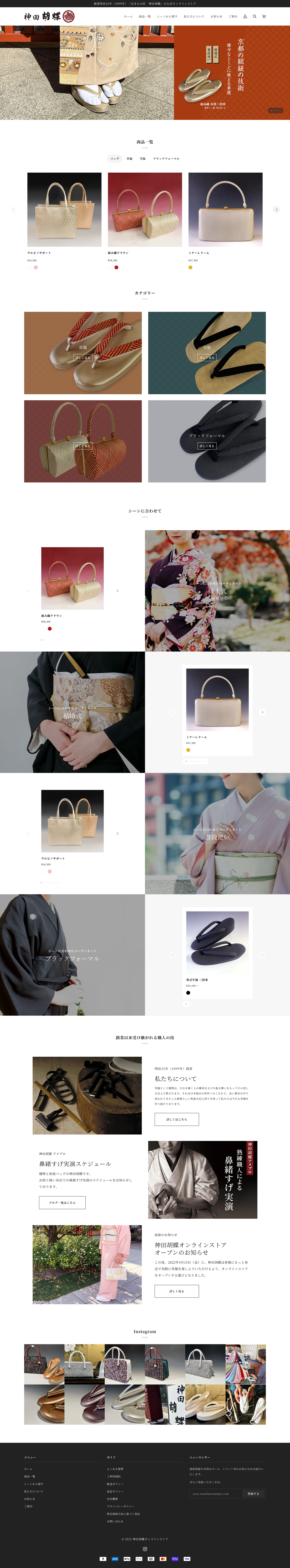 神田胡蝶様の草履のイメージに合った洗練されたデザインを心がけ、TOPページは、各カテゴリーごと、商材がよく見える大きめでわかりやすいグリットレイアウトを採用しています。