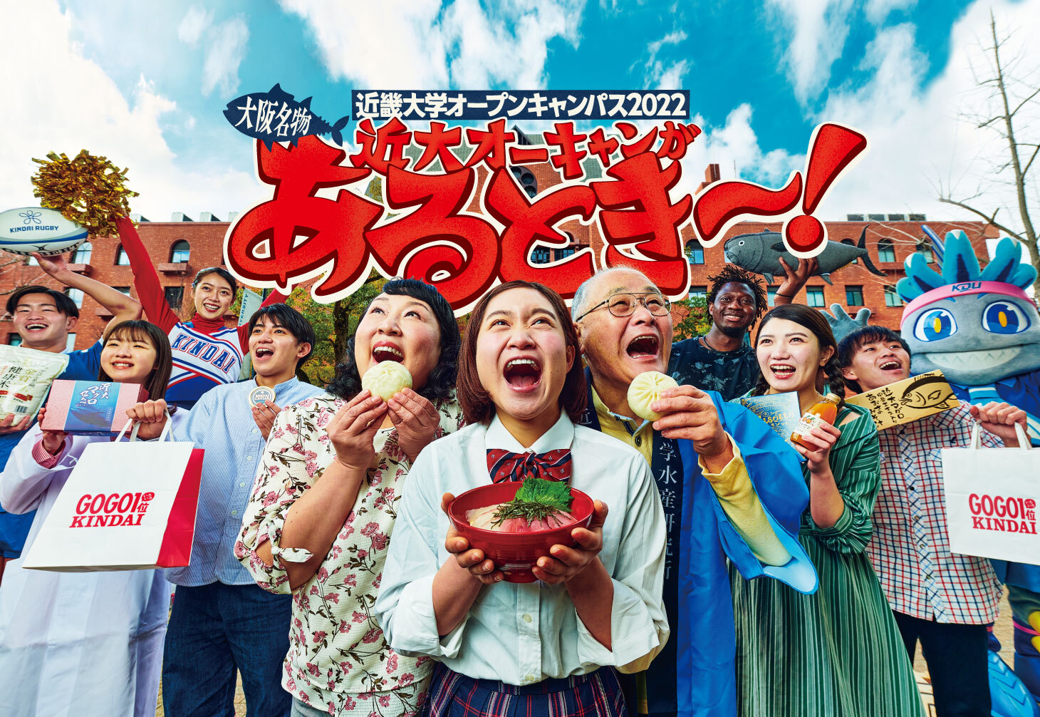 2020年度「CLOSE CAMPUS ~あいてまへん~」、2021年度「行けたら行くわキャンパス」につづき、今年も近大らしい明るい関西ノリを目指し、大阪名物として名高い「551HORAI」とコラボ。底抜けに明るいCMイメージに倣い、キャンパスでの開催があってもなくても、受験生には笑顔でオープンキャンパスに参加して、本学のリアルな雰囲気を体感してほしいという思いを込めたメインビジュアルを制作しました。