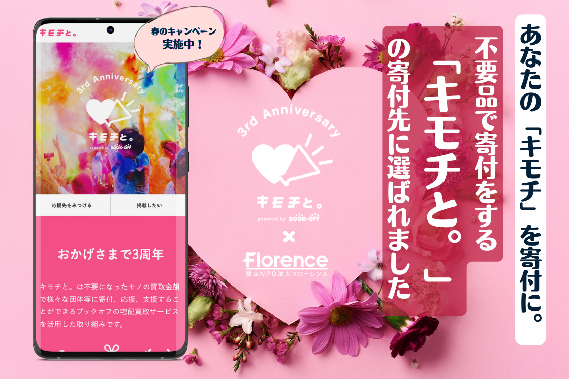 不要品がフローレンスの寄付になる「キモチと。」 4月30日まで本・CD・DVDの寄付金額が10%UP! Webでお申込み、梱包、集荷、寄付の簡単4ステップで、あなたのキモチが、支援を必要としている人の力になります。